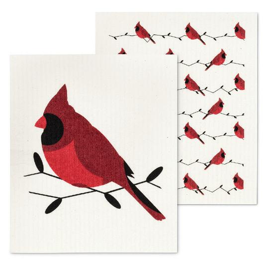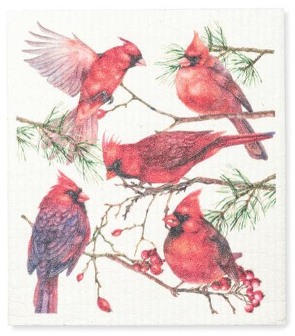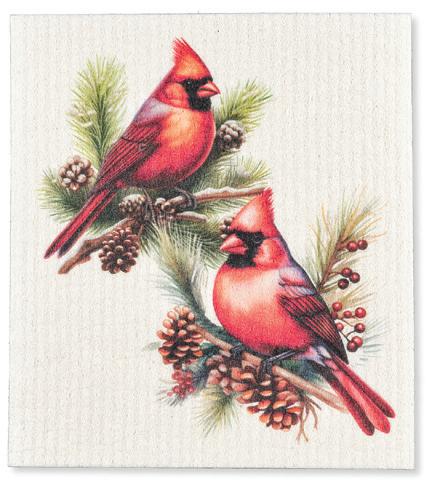 Min 6 6.75x8"L 288/C Cardinals & Pine Cones Dishcloth. Ivory/Red. Cellulose/Cotton.