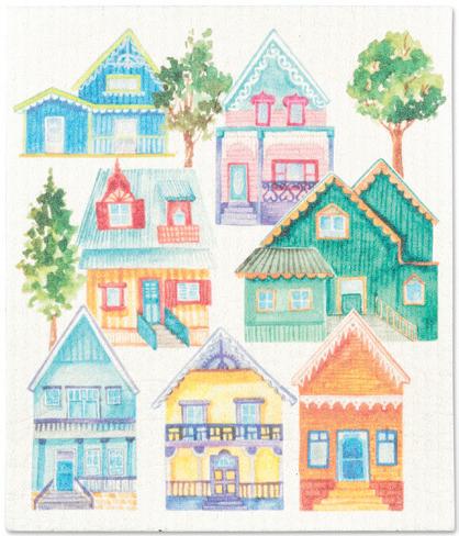 Min 6 6.75x7.5"L 288/C Colourful Houses Dishcloth. Multi. Cellulose/Cotton.