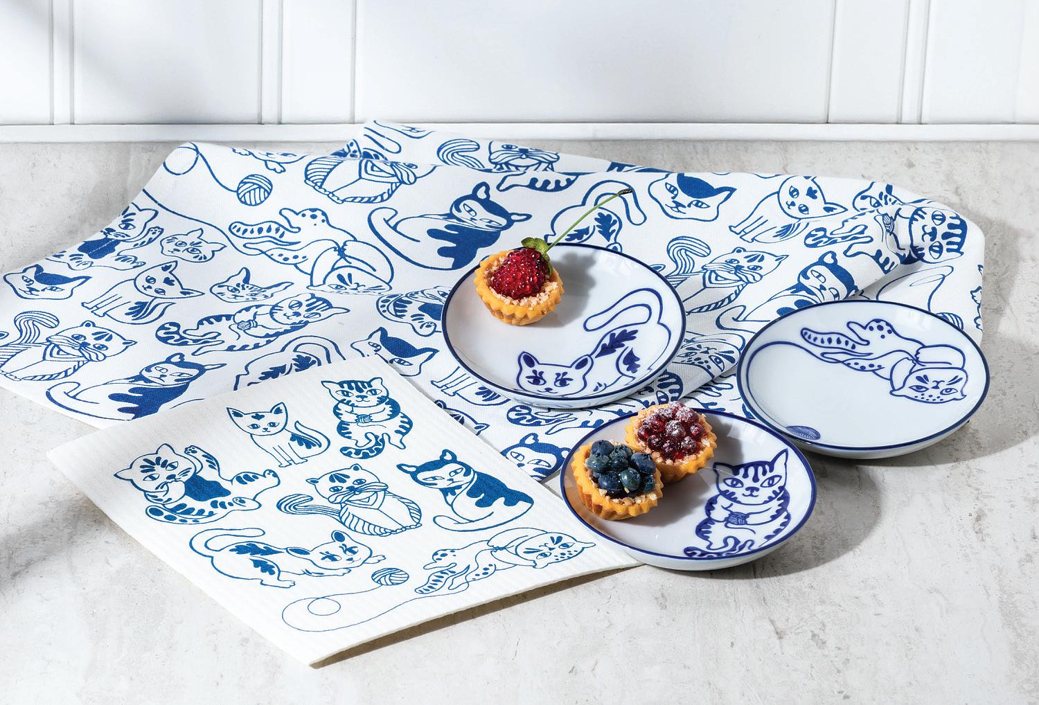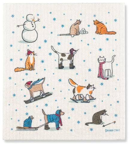 Winter Sports Cats Dishcloth. Ivory/Blue. Cellulose/Cotton.