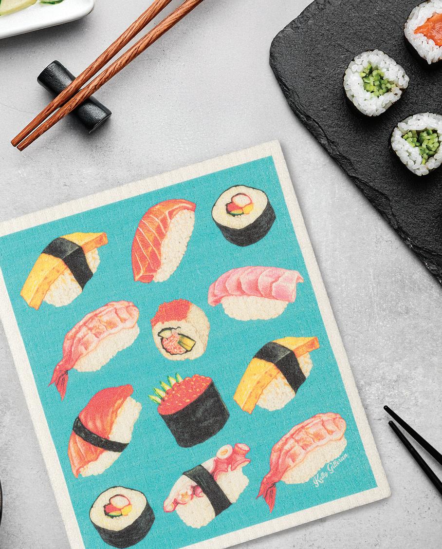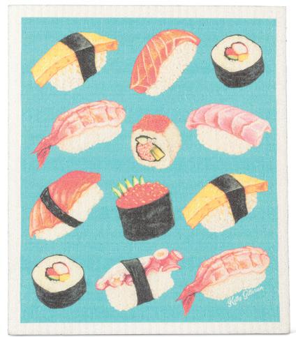 Min 6 6.75x7.5"L 288/C Sushi & Sashimi Dishcloth. Blue/Pink. Cellulose/Cotton.