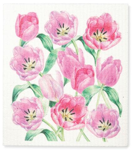 Min 6 6.75x7.5"L 288/C Tulips Dishcloth. Ivory/Pink. Cellulose/Cotton.