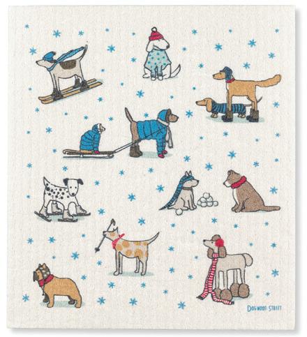 Winter Sports Dogs Dishcloth. Ivory/Blue. Cellulose/Cotton.