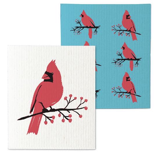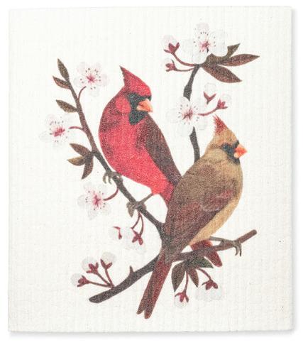 Min 6 6.75x7.5"L 288/C Cardinals & Blossoms Dishcloth. Ivory/Red. Cellulose/Cotton.