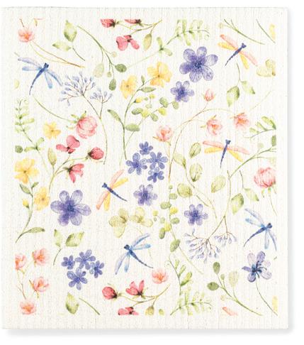Min 6 6.75x7.5"L 288/C Dragonfly & Floral Dishcloth. Ivory/Green. Cellulose/Cotton.
