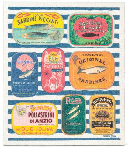 Min 6 6.75x7.5"L 288/C Sardine Tins on Stripes Dishcloth. Navy/Blue. Cellulose/Cotton.