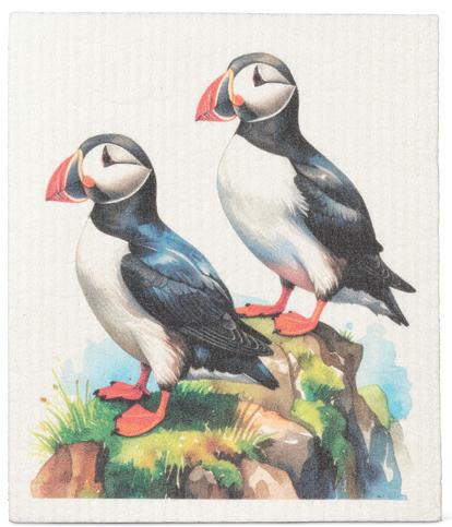 Min 6 6.75x7.5"L 288/C Pair of Puffins Dishcloth. Ivory/Black. Cellulose/Cotton.