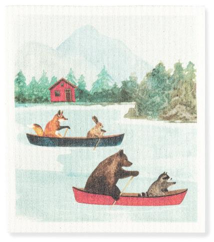 Min 6 6.75x7.5"L 288/C Animals in Canoe Dishcloth. Aqua/Red. Cellulose/Cotton.