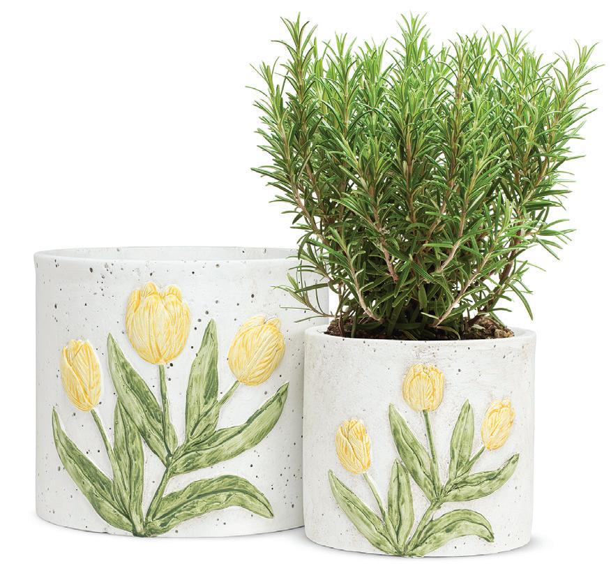 Min 1 4.5"H Ø:4"D 18/C Small Planter with Tulip. White/Yellow. Cement.