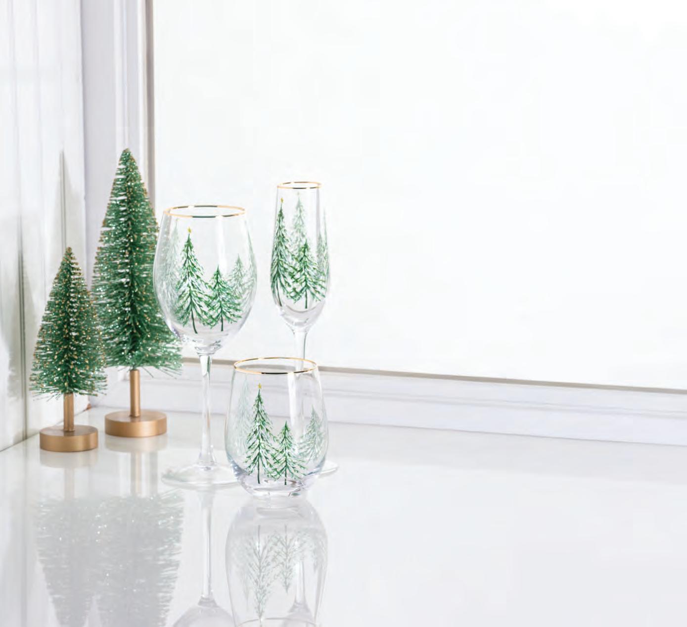 Min 4 8.5"H (16oz) 24/C Winter Trees Goblet Green/Clear. Glass.