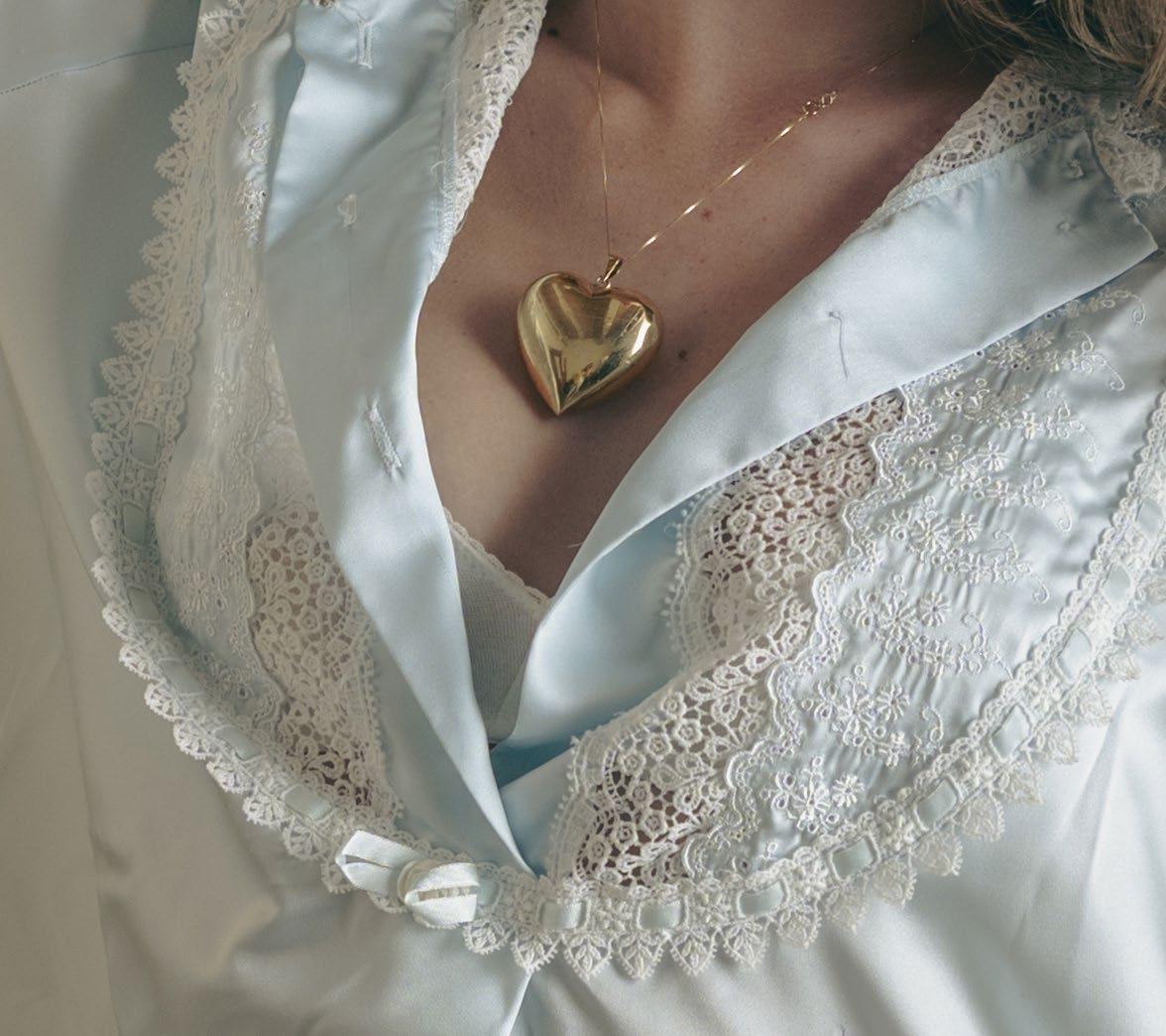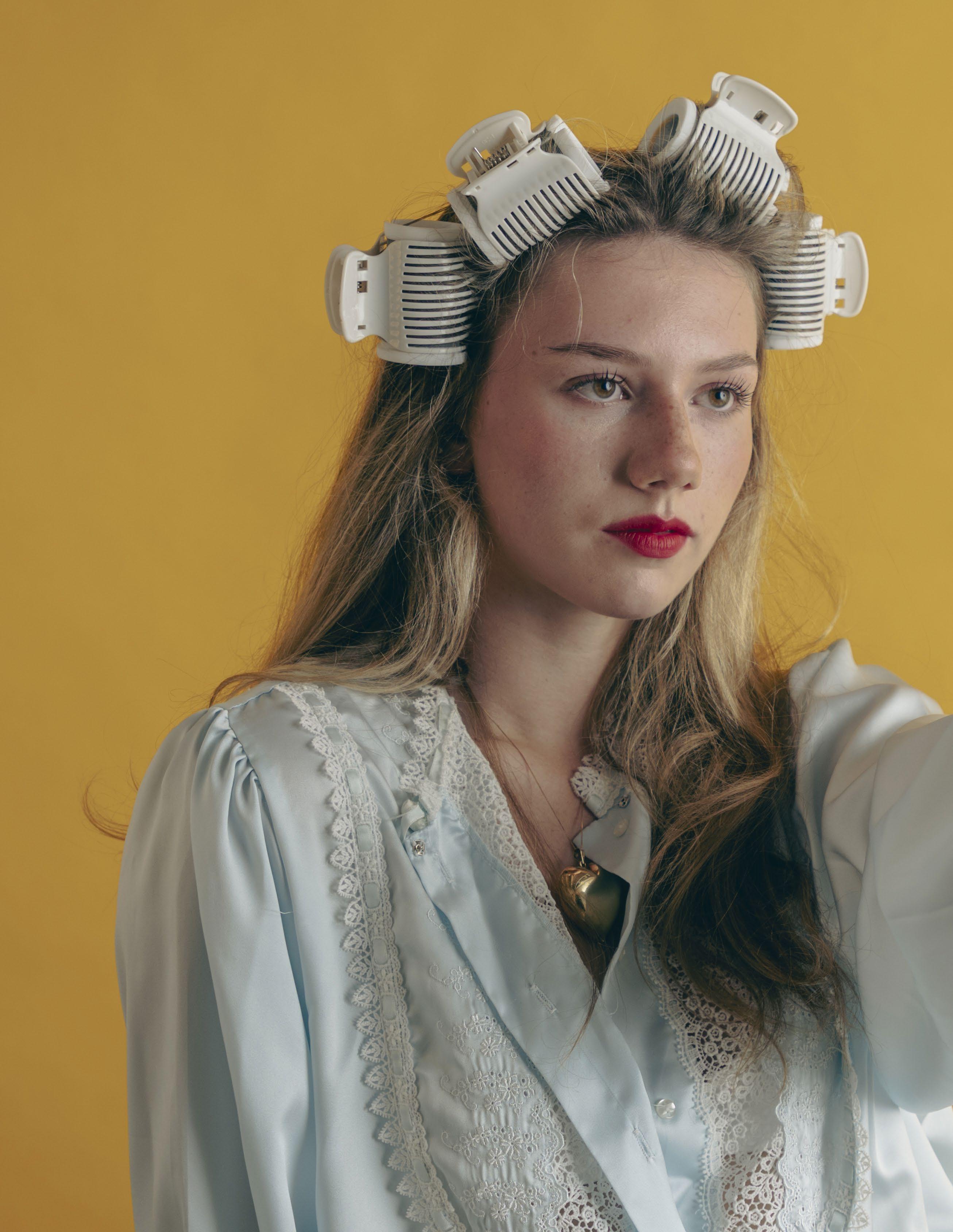 Set indoors, cozy in yellow lighting, in silk and lace babydoll dress, the first look is the inherent contradiction of “private glamor.” Huge hair rolls, deliberate makeup, an unending skin care routine — every moment appears rehearsed for film and intimate at the same time.