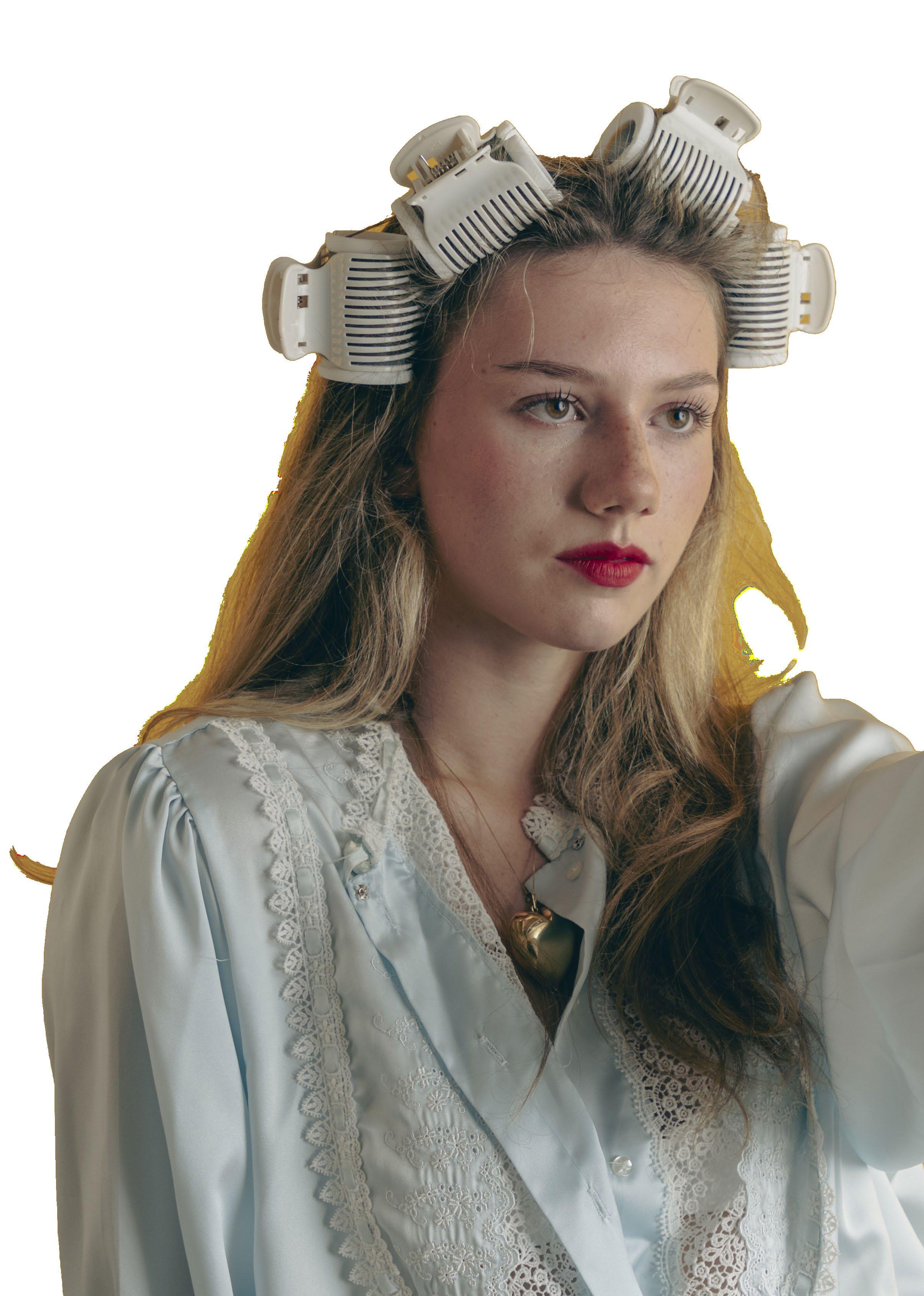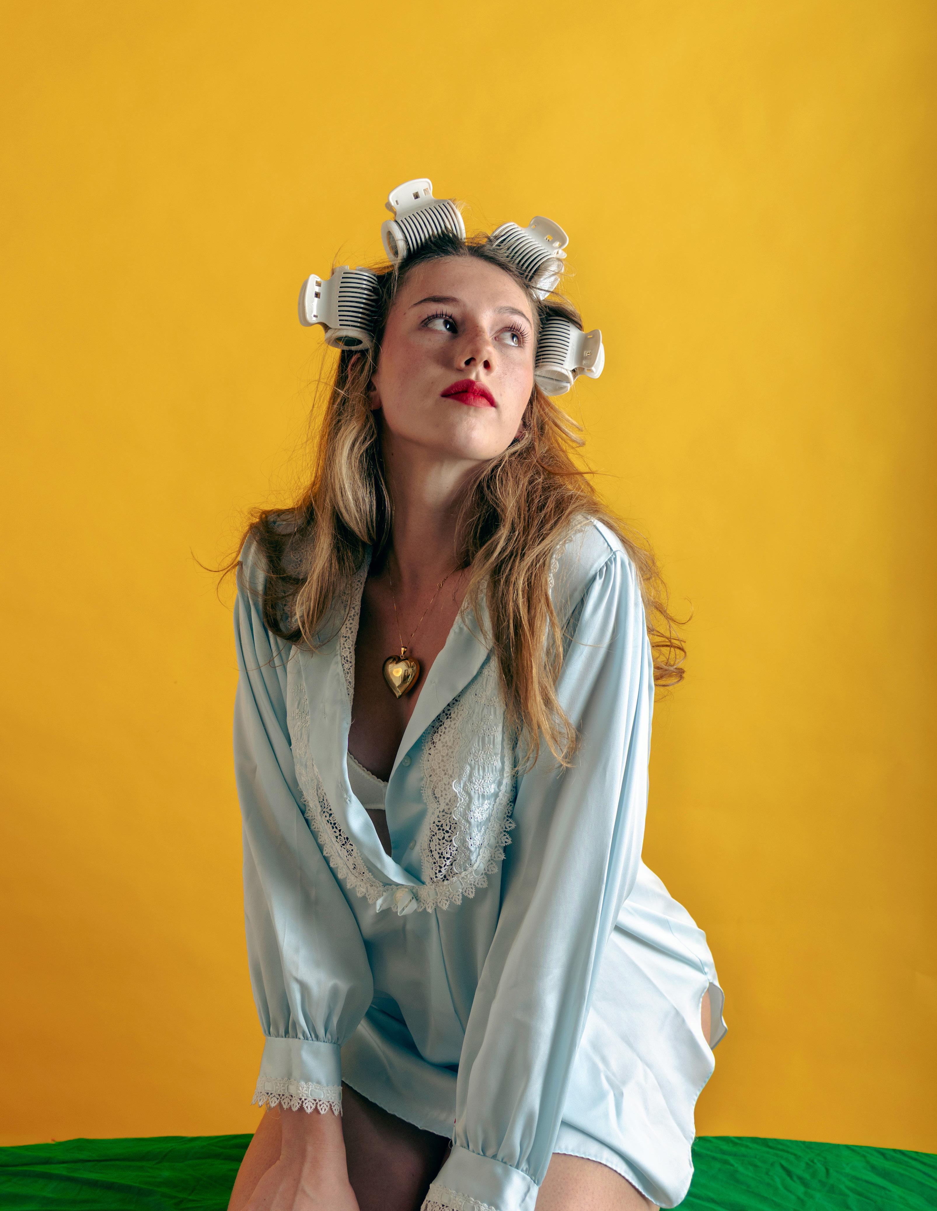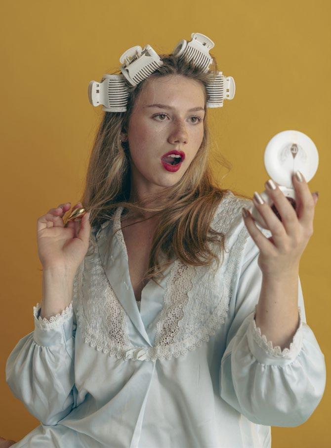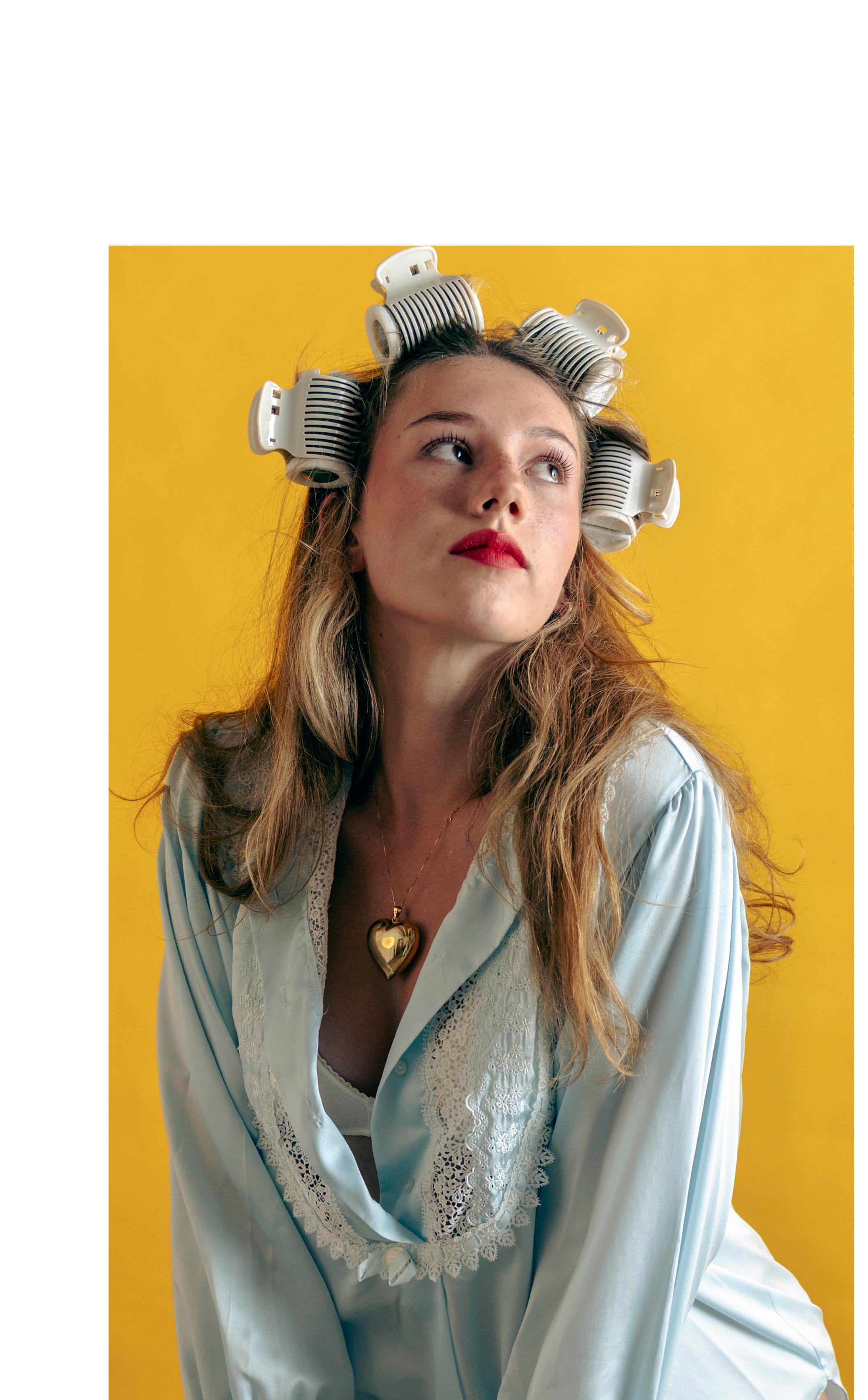 Self-care staged for an invisible audience, an elevated routine in pajamas. The look embraces artifice and control, suggesting that even solitude can become a form of presentation. In modern camp, privacy is never entirely yours — the performance continues beyond your own body and eyes.