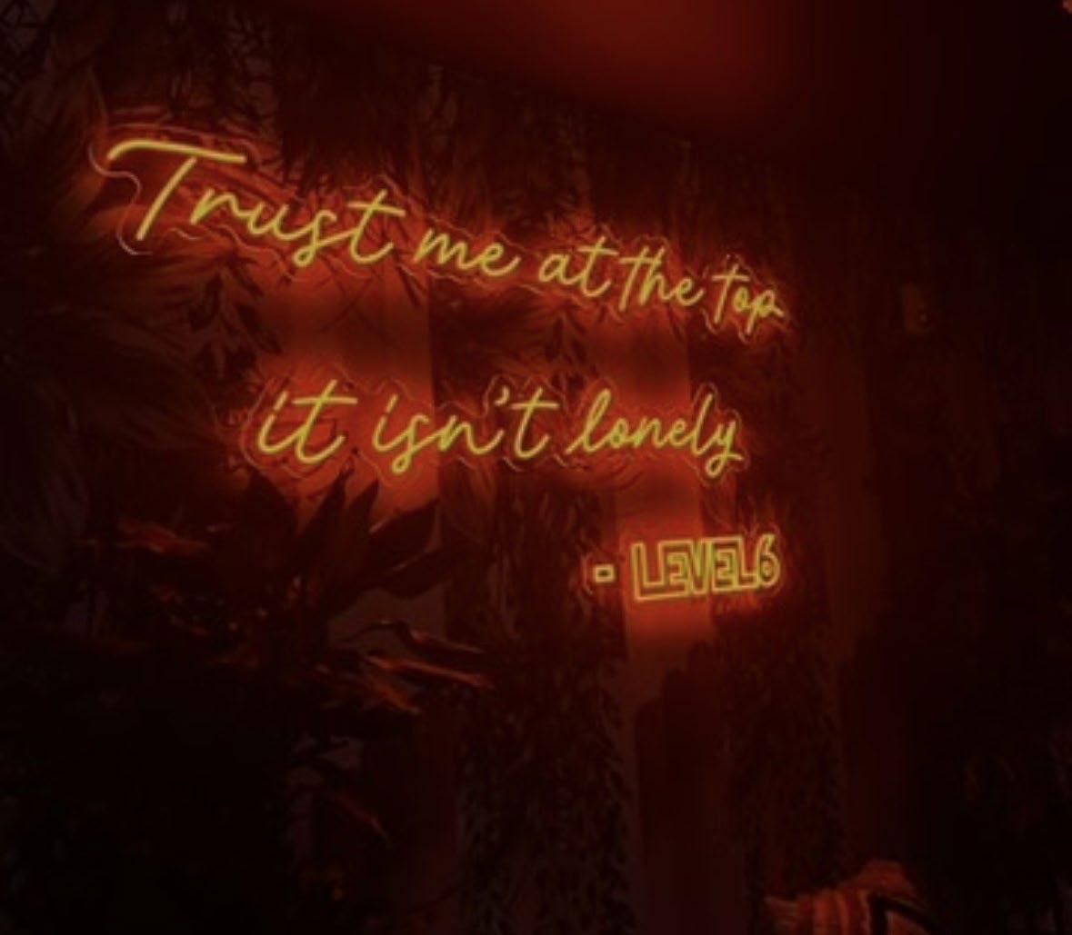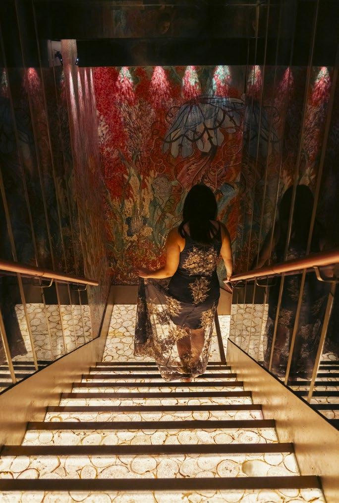 Following the arrow, you go up a dark staircase with the walls covered in glowin-the-dark vaguely psychedelic paintings. Every part of the climb’s atmosphere is intentional. Each stair has words written on them, reading “all night,” “techno” or another snippet of what the night might entail. If you look up, hexagonal lights cover the ceiling, further curating Club Space’s perfect environment as you take the last few steps onto the terrace.