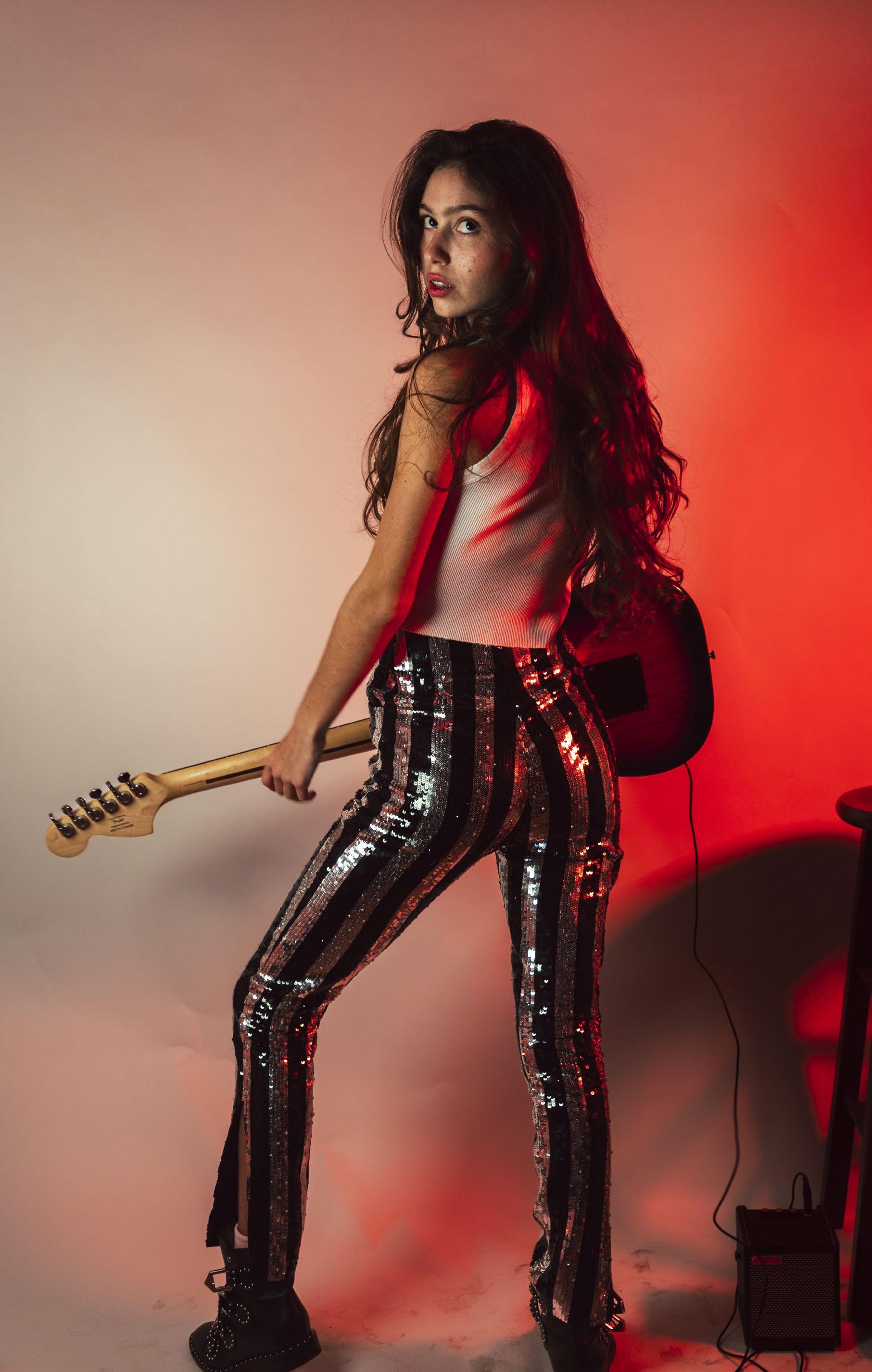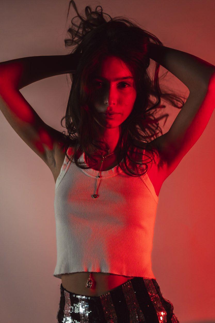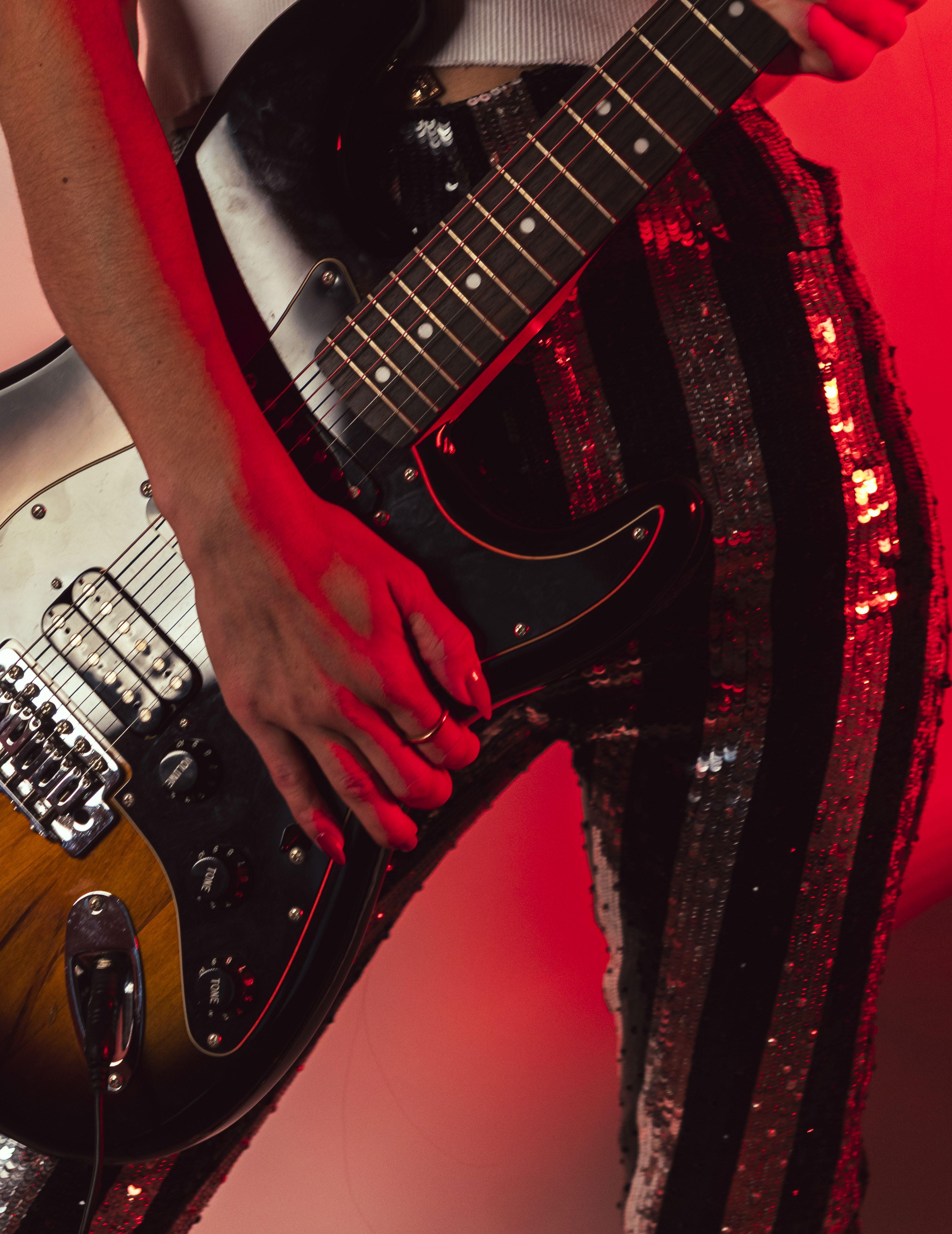 Channeling the energy of 1970s and 80s glam rock, the second look draws inspiration from Mick Jagger and the theatrical masculinity of the Rolling Stones era. Wild, undone hair, body-defining stretch sequin pants and fluid masculine silhouettes emphasize both power and rebellion. The styling prioritizes masculine energy — open wide hip, loose shoulders, confident posture — allowing the body itself to carry the swag. Sensuality and androgyny blur together, creating a presence that feels both rebellious and performative at the same time.