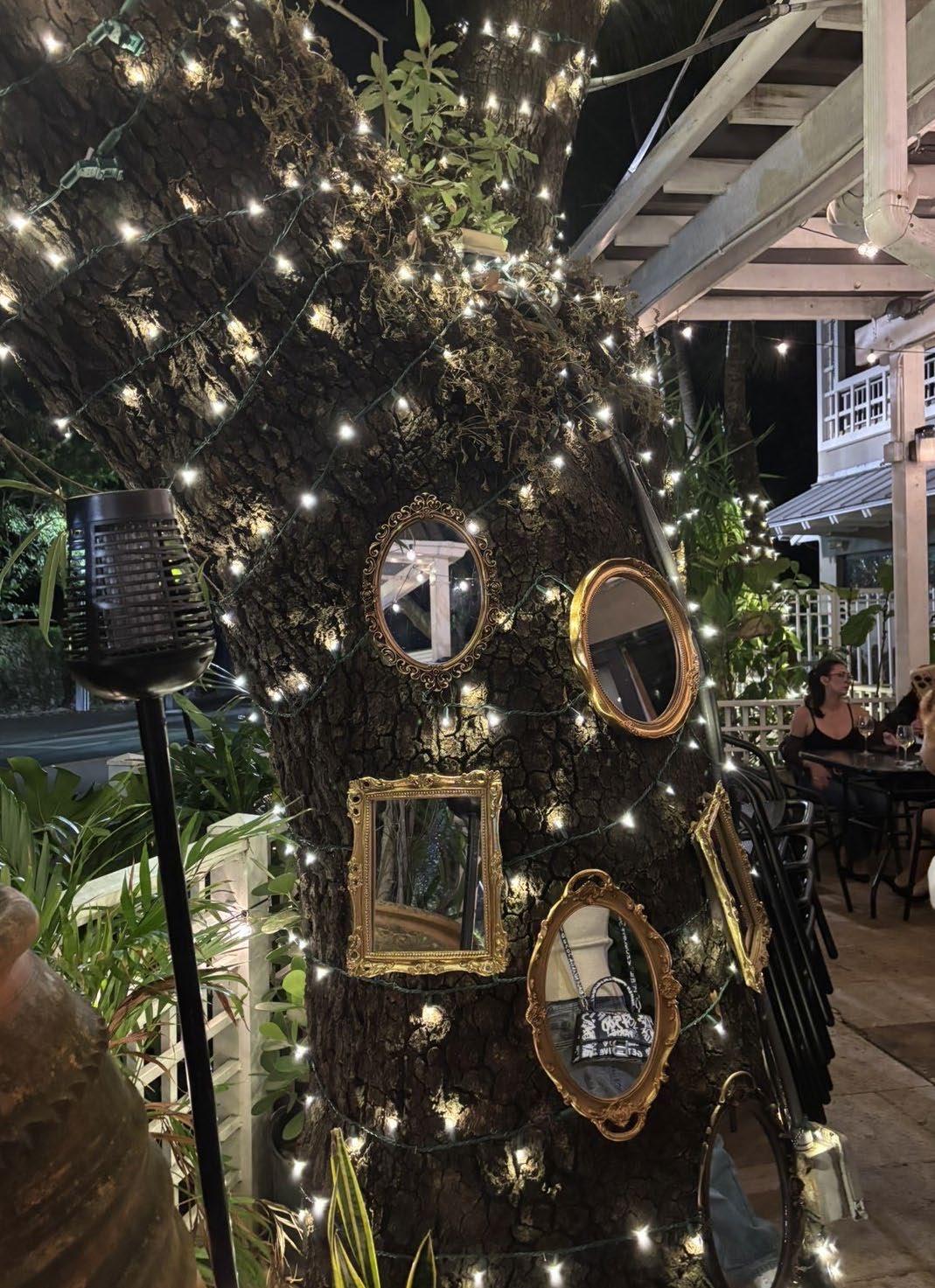 Mirrors and fairy lights decorate a tree at Magie, an outdoor wine bar in Coconut Grove.
