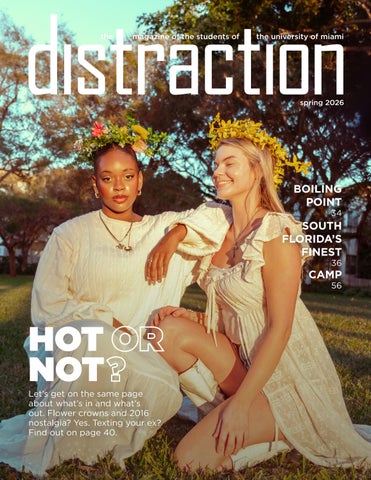 The magazine is produced four times per year, twice a semester. City Graphics and Bellak Miami printed 2,000 copies of the magazine on 8.5 x 11 inch, 60-pound coated text paper 4/4. The entire magazine is printed four-color and perfect bound. Most text is nine-point Minion Pro with 9.8 points of leading set ragged with a combination of bold, medium and italic. All pages were designed using Adobe Creative Suite CC software InDesign with photographs and artwork handled in Photoshop and Illustrator. For additional information, visit distractionmagazine. com. Questions and comments can be sent to 1330 Miller Drive, Student Media Suite 202A, Coral Gables, FL, 33146, dropped into SSC Student Media Suite Suite 200 or emailed to distraction305@ gmail.com. All articles, photographs and illustrations are copyrighted by the University of Miami.