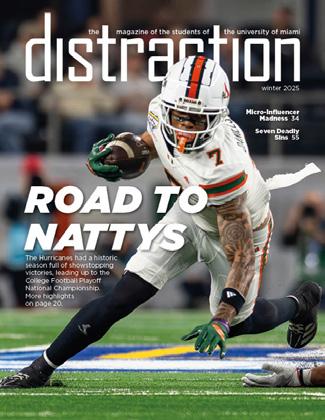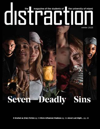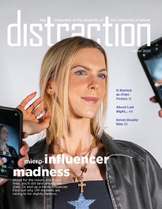 The magazine is produced four times per year, twice a semester. City Graphics and Bellak Miami printed 2,000 copies of the magazine on 8.5 x 11 inch, 60-pound coated text paper 4/4. Te entire magazine is printed four-color and perfect bound. Most text is nine-point Minion Pro with 9.8 points of leading set ragged with a combination of bold, medium and italic. All pages were designed using Adobe Creative Suite CC sofware InDesign with photographs and artwork handled in Photoshop and Illustrator. For additional information, visit distractionmagazine.com. Questions and comments can be sent to 1330 Miller Drive, Student Media Suite 202A, Coral Gables, FL, 33146, dropped into SSC Student Media Suite Suite 200 or emailed to distraction305@gmail.com. All articles, photographs and illustrations are copyrighted by the University of Miami.