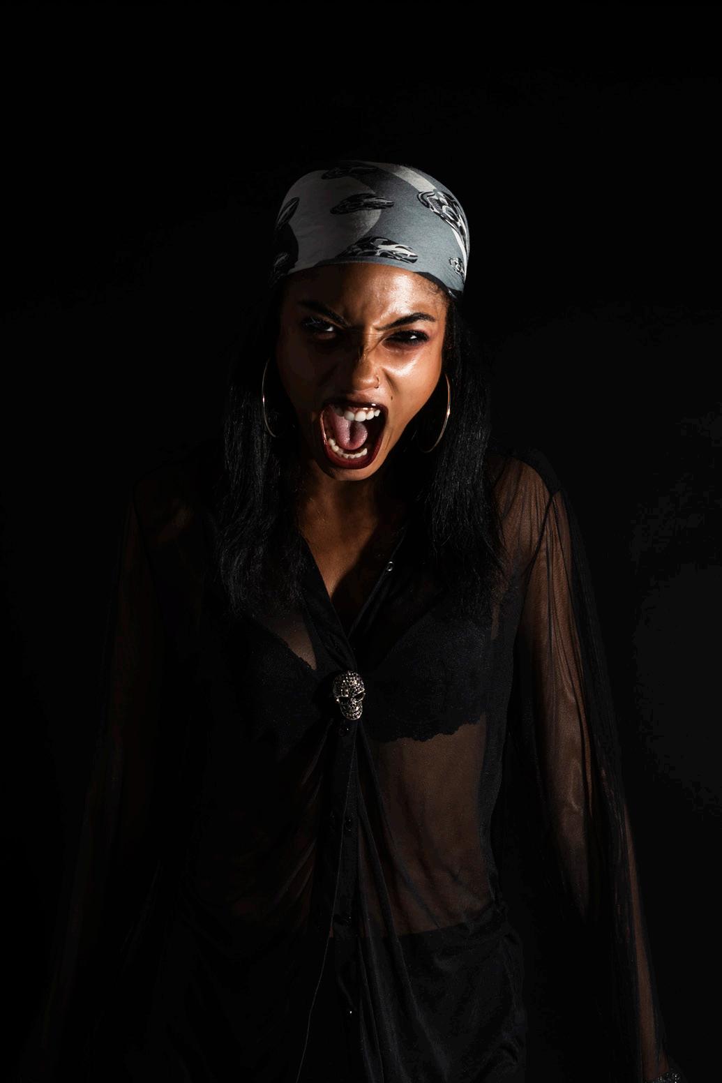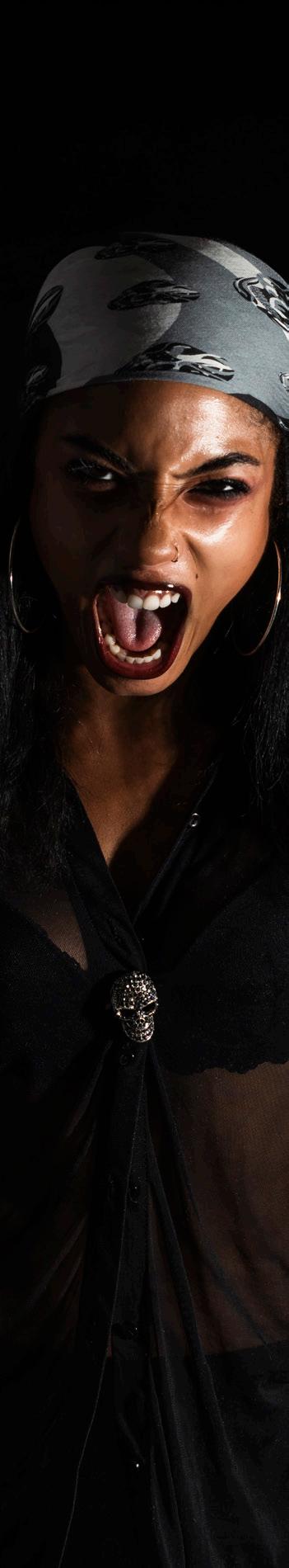 Wrath wears a deep red lip: the darker, the better. Bold, dark brows and dark smoky eyes are the key to accentuating wrath’s penetrating gaze. Lean into your wrath look by wearing black, accented with shimmery silver and gold highlights. Tis look is all about exuding confdence and power.