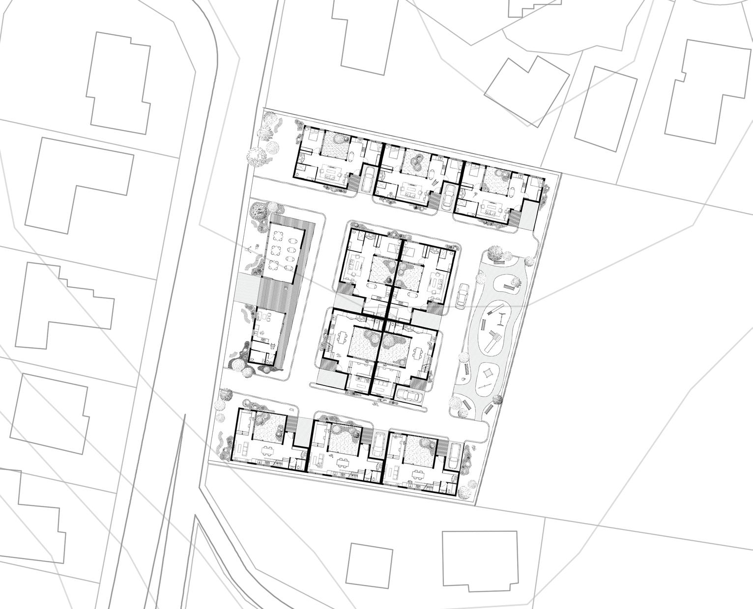 Cutting through the two tallest buildings in the complex, these figures reveal the alignment of the storeys and the workings of the vertical circulations. It also explores how the project responds to the terrain, where the concrete forest are intertwined with actual woodlands.
