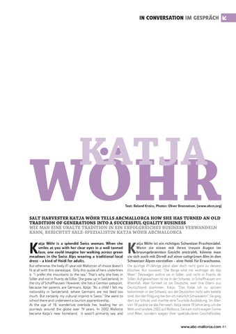 SALT HARVESTER KATJA WÖHR TELLS ABCMALLORCA HOW SHE HAS TURNED AN OLD TRADITION OF GENERATIONS INTO A SUCCESSFUL QUALITY BUSINESS WIE MAN EINE URALTE TRADITION IN EIN ERFOLGREICHES BUSINESS VERWANDELN KANN, BERICHTET SALZ-SPEZIALISTIN KATJA WÖHR ABCMALLORCA atja Wöhr is a splendid Swiss woman. When she smiles at you with her clear eyes in a well tanned face, one could imagine her walking across green meadows in the Swiss Alps wearing a traditional local dress - a kind of Heidi for adults.