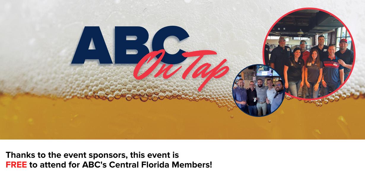 For all events and training sessions scan the individual QR codes or visit abccf.org AUGUST 9 National ABC EIC Webinar 10 ABC On Tap - Gatlin Hall Brewing 15 Maximize Your Membership Workshop 18 Casino Night Workforce Development FundraiserOrlando Science Center SEPTEMBER 8 Fall Golf Tournament #1 - Orange County National 13 Future Member Event – Help Membership Grow! 21 Construction Expo at Central Florida Fairgrounds 29 Fall Golf Tournament #2 - Orange County National OCTOBER 14 EIC Awards Banquet at Hilton Orlando, Destination Parkway 26 ABC On Tap at Gatlin Hall Brewing CONNECT EVENTS CALENDAR Request an ABC Member digital logo Email logorequests@abccf.org to get your logo today! NOVEMBER 9 Chilli Cook Off at Apopka Amphitheatre 14 Maximize Your Membership DECEMBER 1 Sporting Clays Shoot at Polk Sporting Clays 7 Holiday Party at Amphibious Group 14 Young Professional Winter Olympics Scan the QR code for ABC Calendar Associated Builders & Contractors of Central Florida (ABC CF) | 651 Danville Drive, Suite 200, Orlando, FL 32825 | Phone: 407.628.2070 maximize your membershipworkshop This FREE workshop is designed to help new, existing, and future ABC members learn how to utilize their membership for maximum effectiveness and return on their investment. AUGUST 10, 2023 | 5:30 - 7:00 PM Gatlin Hall Brewing Aug 15 Aug 10 Thanks to the event sponsors, this event is FREE to attend for ABC’s Central Florida Members!