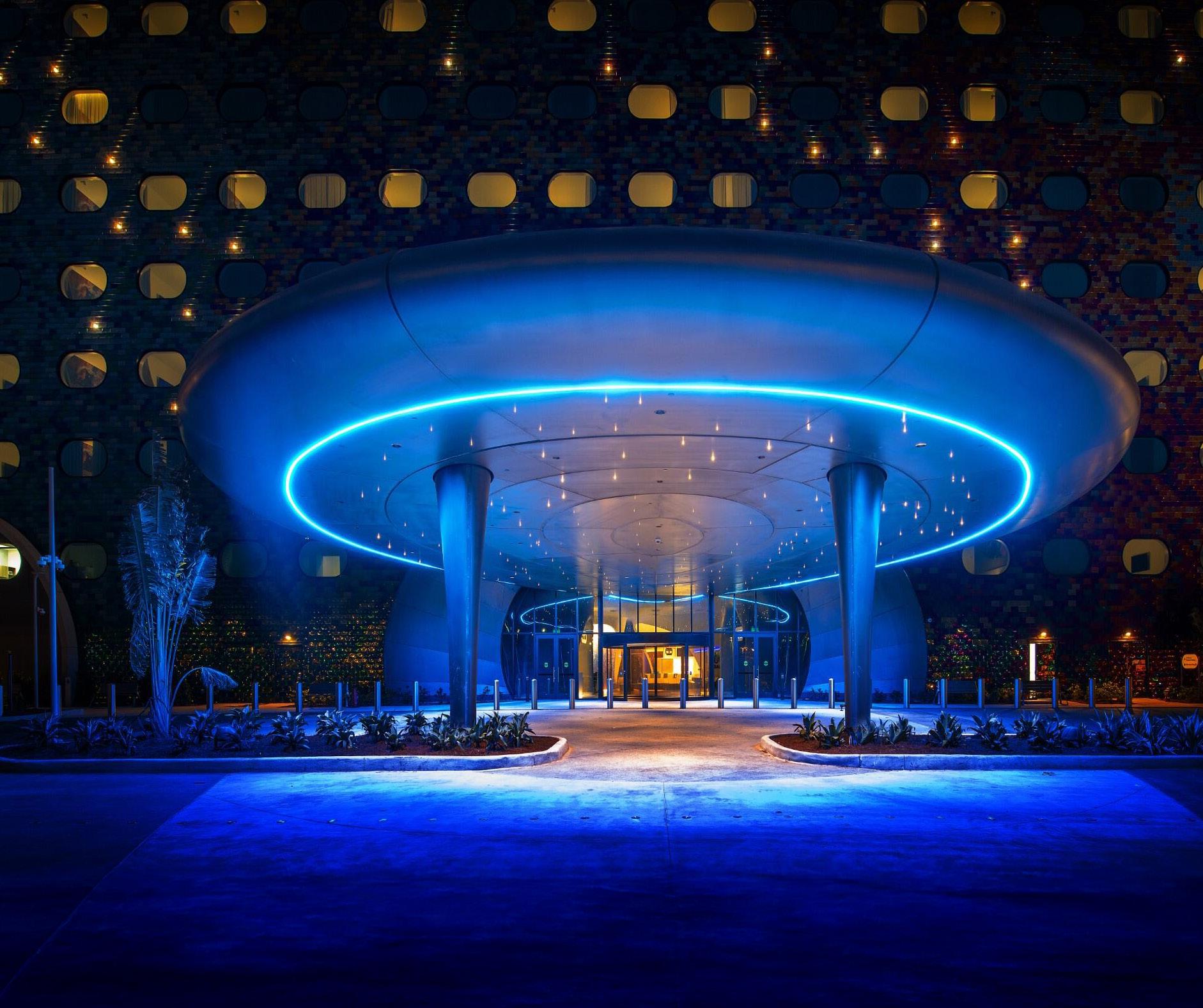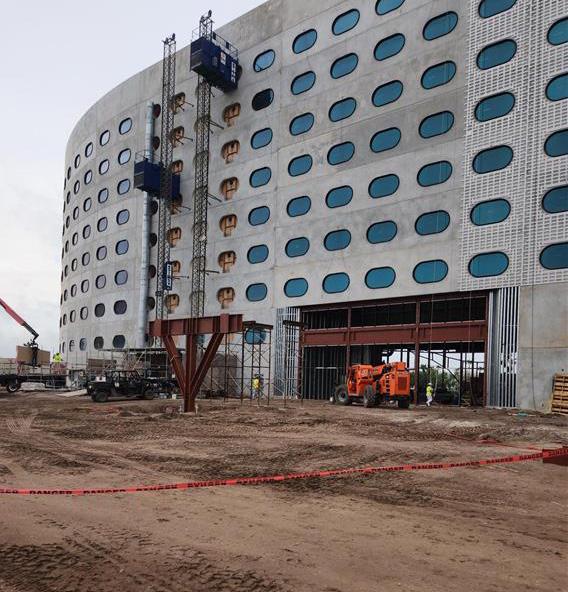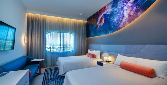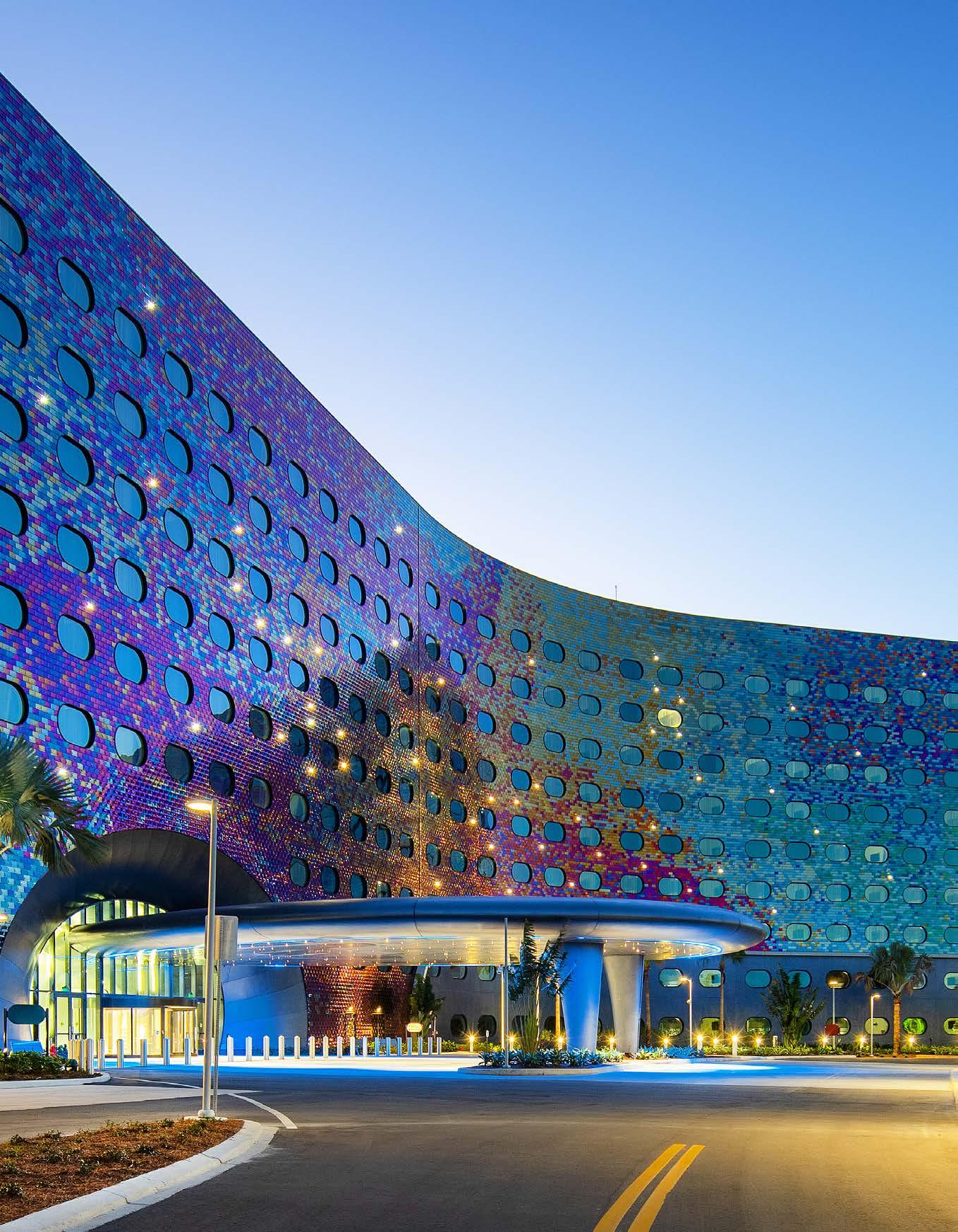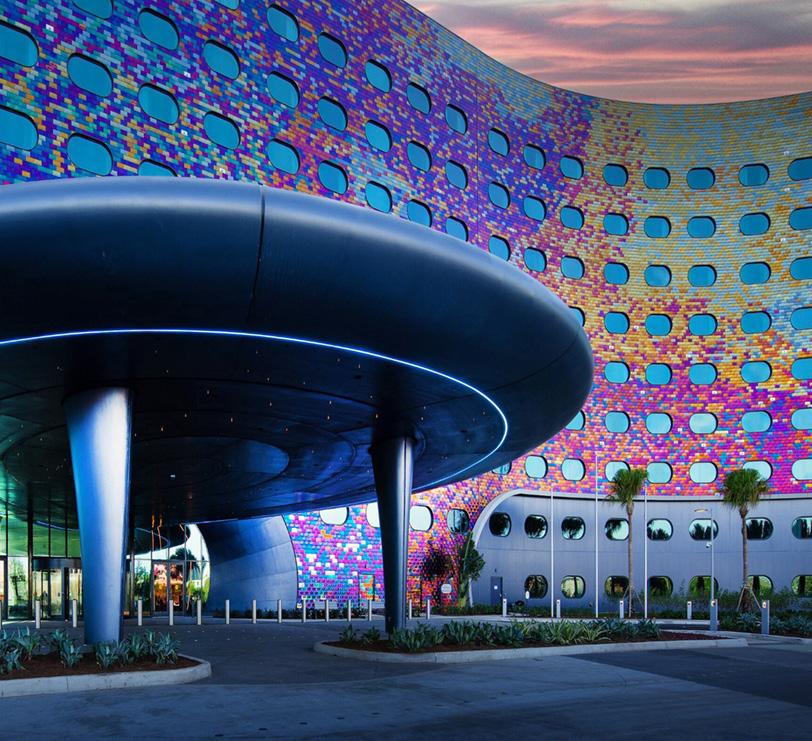 Universal Orlando’s Stella Nova rises like a shimmering galaxy, its curved façade clad in more than 140,000 dichroic stainlesssteel tiles that shift color with the light bringing Universal’s celestial theme to life. Designed and built by FINFROCK, the nine-story resort fuses strength and artistry—transforming the skyline and immersing guests in a celestial experience unlike any other.