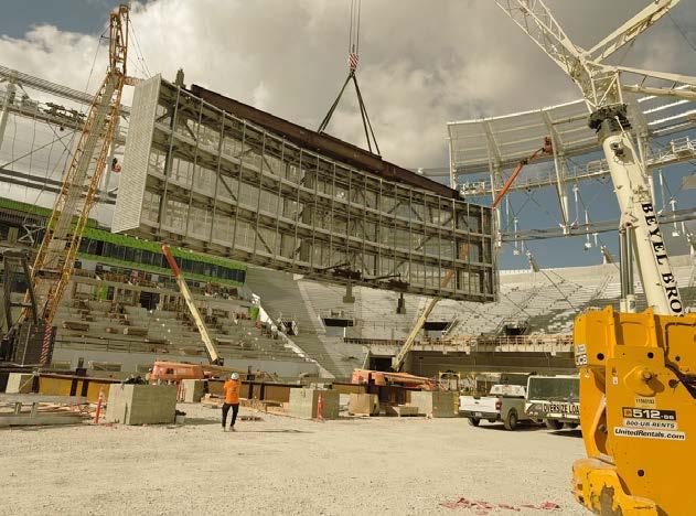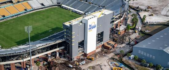 …the UCF West Tower (Roth Tower) project consisted of the renovation and vertical expansion of the existing stadium tower. The expansion includes new premium club seating, luxury suites, and outdoor sky suites. It also incorporates flexible indoor spaces designed for year-round events beyond football games. Keller was contracted to provide deep foundation support for the new structure by installing 144 each 16-inch-diameter, 95-foot-long augercast piles; to strengthen the existing foundation by installing 70 each 5.5-inchdiameter, 93-foot-long micropiles; and to provide excavation support for the new foundation work through the use of 20,000 gallons of chemical grouting. Keller completed all scopes of work in March 2025, and the overall project is scheduled for completion before the start of the 2026 college football season.