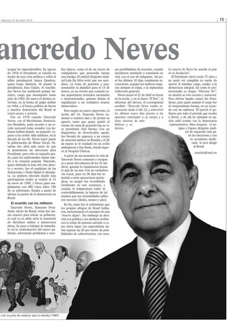 ancredo Neves surgen los imponderables. En agosto de 1954 el Presidente se suicidó en medio de una crisis política y subió al sillón presidencial Janios Quadros, quien luego dimitiría. Al asumir la presidencia Joao Gulart, el conciliador Neves fue nombrado primer ministro, cargo que desempeñó hasta julio de 1962. De nuevo el destino intervino, en la forma de golpe militar en 1964, y el futuro político de Neves y muchos demócratas del Brasil se tornó oscuro e incierto. Fue en 1978 cuando Tancredo Neves, con el Movimiento Democrático Brasileño, pudo acceder a un escaño nacional como senador. Los militares habían dejado un pequeño espacio a los civiles. Más adelante, en la década de los 80, Neves logró ganar la gobernación de Minas Gerais. Pasarían dos años más antes de que se permitieran las elecciones para Presidente, pero sólo en segundo grado, pues los uniformados tenían miedo a la votación popular. Tancredo, quien defendía la tesis del voto directo y secreto, fue el candidato de los demócratas y Paulo Maluf el oficialista. La primera elección donde solo participarían civiles se realizó el 15 de enero de 1985, y Neves ganó ampliamente con 480 votos sobre 180 de su adversario. Estaba a punto de abrirse la puerta de la democracia en Brasil.