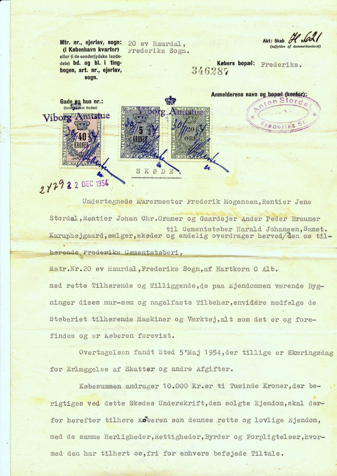 Enantagetløsningvistesig,daKnud ErikJohansenkunneviseetskødefra dengangi1954,dahansfarovertog cementstøberiet.Herfremgardet,at sælgerneafFrederiksCementstøberi erhelefirepersoner:FrederikMogensen,JensStordal,JohanChr.Cramerog AndersPederBrauner.
