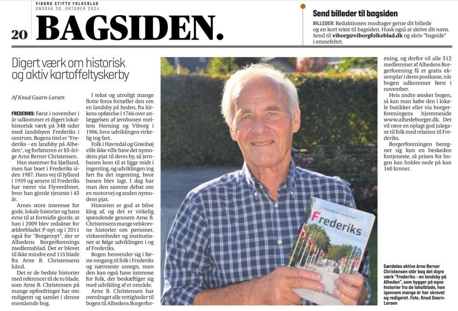 Den 3. november holdt vi reception i Pakhuset i anledning af udgivelsen af bogen ”Frederiks, en landsby på Alheden” skrevet af Arne Berner Christensen. I bestyrelsen betragter vi det som et stort privilegie at få lov til at udgive bogen, som giver en fantastisk indsigt i udviklingen i Frederiks – en udvikling der hele tiden har været båret af driftige lokale og ildsjæle, som har lagt utallige timer i frivilligt arbejde. En stor del af stoffet har gennem årene været bragt i Borgerforeningens medlemsblad og i P-Nyt, men i bogen er det sorteret og opdateret, så man får et godt overblik over udviklingen i Frederiks, hvilket er en gave for tilflyttere som mig, der ikke har fået historien ind med modermælken.