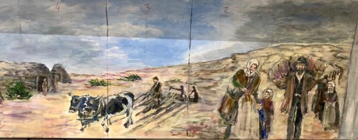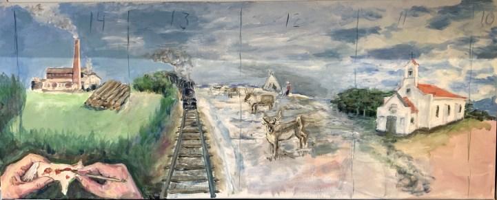 Det har været spændende at følge udviklingen med det kommende gavlmaleri, hvor Tove Andreasen jævnligt holder projektgruppen orienteret. I september-oktober blev alle plader grundet og baggrundsmalet, hvorefter de kom indendørs, hvor motiverne males. Det er en stor fordel, at hun kan stå hjemme indendørs og male, for med al den regn, vi har haft i sidste par måneder, ville det have været vanskeligt (for ikke at sige umuligt) at male direkte på Brugsens væg. Der bliver heller ikke spildt tid på kørsel fra Vroue.