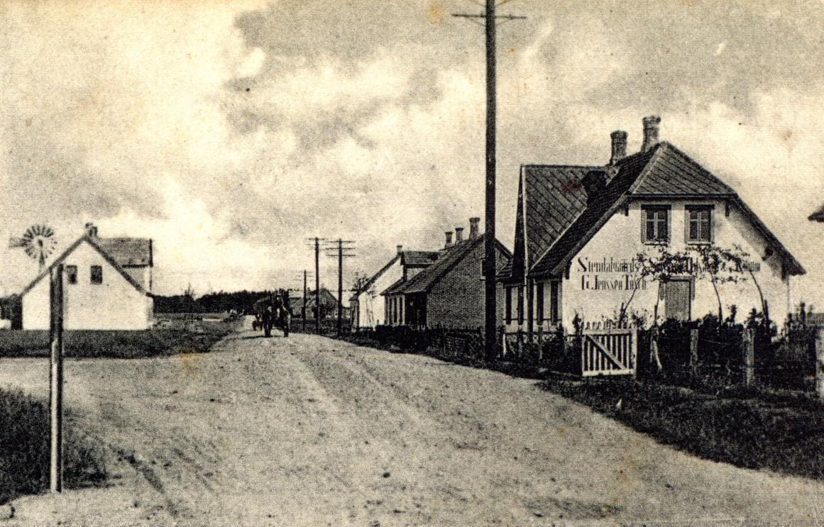 På billedet fra ca. 1910 ses vindmøllen til cementstøberiet til venstre over taget på maler Sørensens hus. (Søndergade 11).
