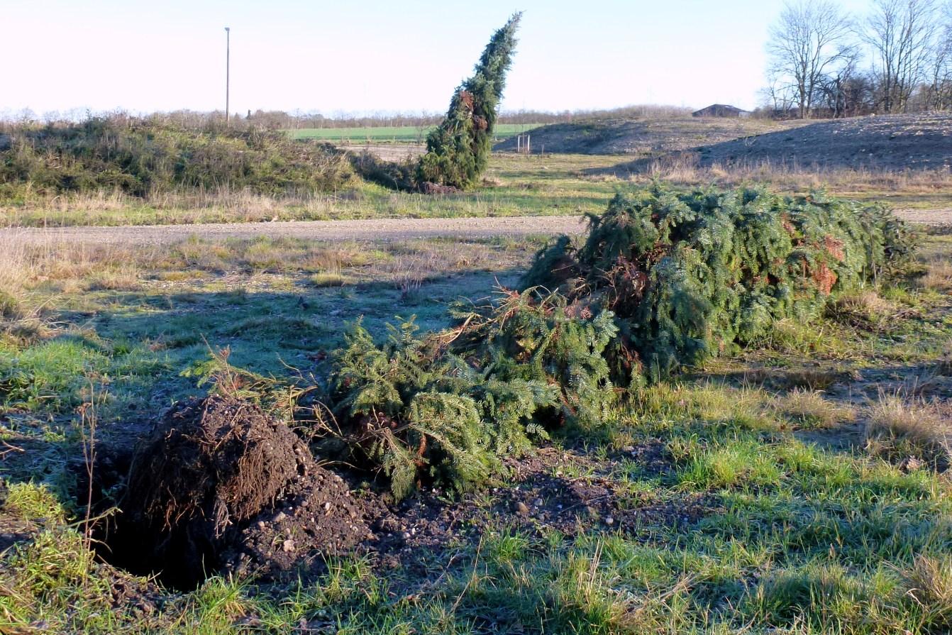 ..at det var tvivlsomt, om de to høje graner, som for nogle måneder siden blev plantet i Trehuseparken, kunne få fat og gro videre ...det gav blæsten snart svar på
