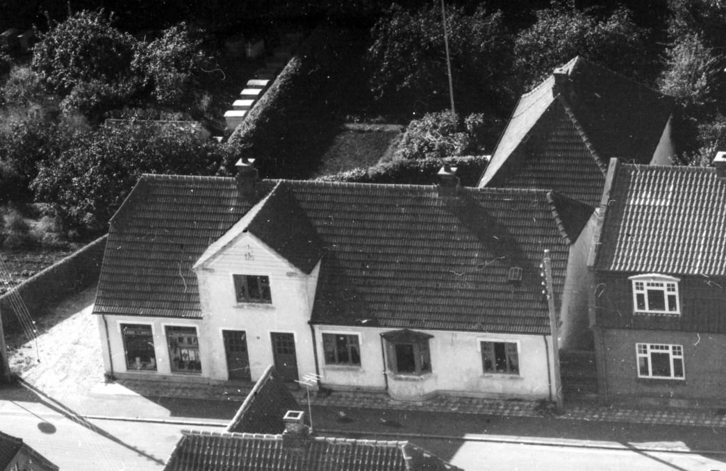 Før 1960. Nørregade 17, øverst tv. ses Vestergade 4. Kirstine havde butik bag vinduet th. og indgangsdøren er lige tv. for vinduet. Den øverste del af sandgraven er nu fyldt op med affald og overdækket med jord. Hus og skur længere nede er en del af støberiet, som stadig står i sandgraven. Også den del bliver efterhånden fyldt op.