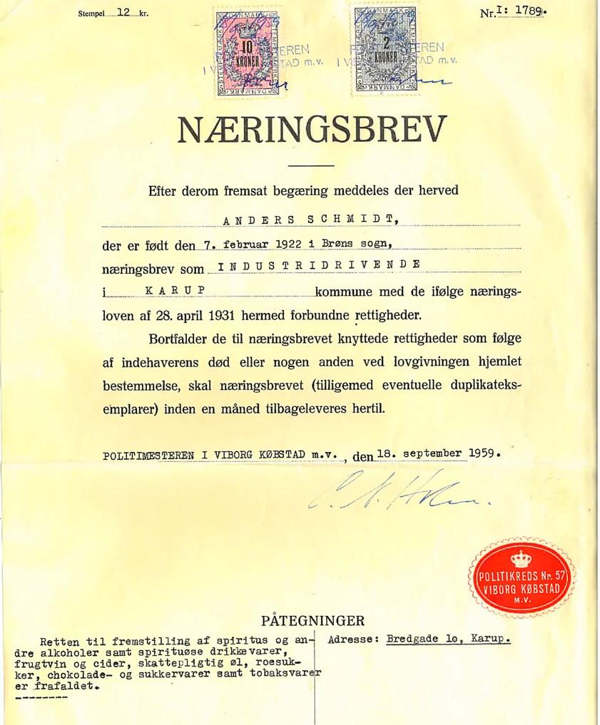 Anders var den formelle ejer af fabrikken, og for at kunne drive denne var han nødt til at erhverve næringsbrev som ”industridrivende i Karup” på adressen Bredgade 10 i Karup. Et sådant fik han udstedt i Viborg 18.9.1959.