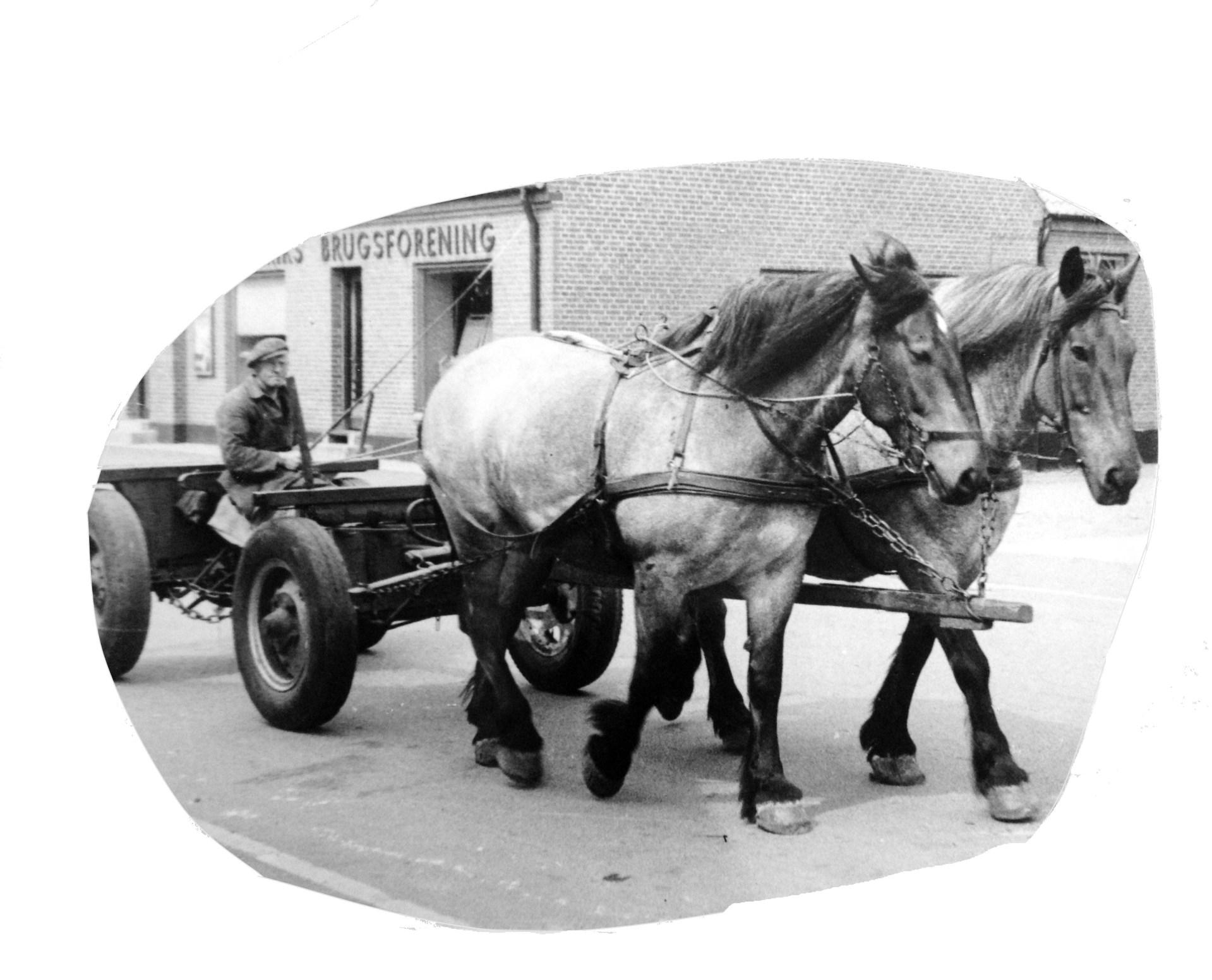 hvor de en overgang havde 4 store belgiske heste, som faderen og en medhjælper brugte til at hente træ i plantagerne ved Frederiks, og også fra Kompedal og