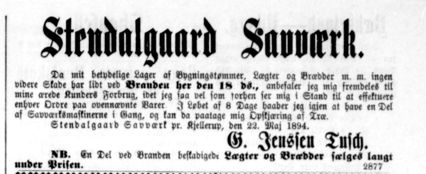 Den store brand Katastrofen indtraf den 18. maj 1894 da Stendalgaard Savværk og hovedparten af gårdens bygninger nedbrændte. Ilden startede i savværket, hvis trætag blev antændt af gnister fra skorstenen. Da ilden blev opdaget anede man ikke, at der kunne være fare for skovridergården, men inden længe havde ilden fået fat i en af gårdens bygninger, og snart havde den fat i gårdens driftsbygninger,