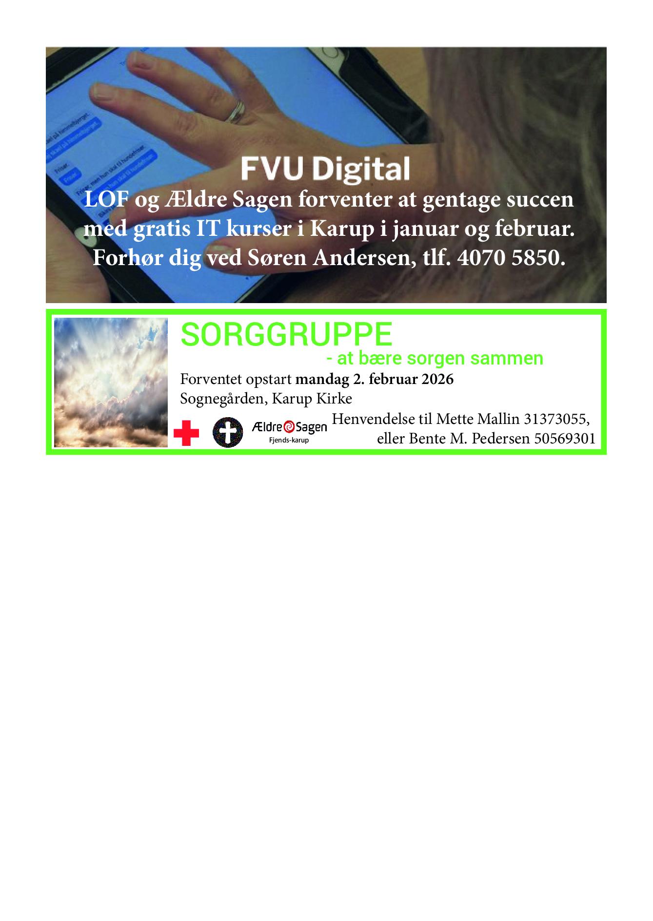Har du behov for at tale om at miste eller om sorg, så kan du henvende dig til Mette Mallin 3137 3055 eller Bente M. Pedersen 5056 9301