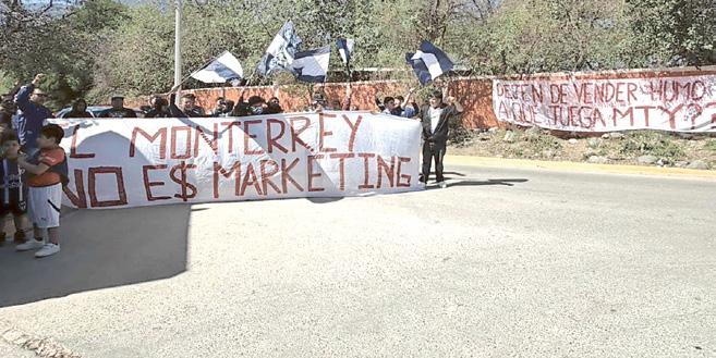 Un grupo de alrededor de 30 seguidores se manifestó en las instalaciones de El Barrial, donde entrenaron los Rayados, con mantas y consignas.
