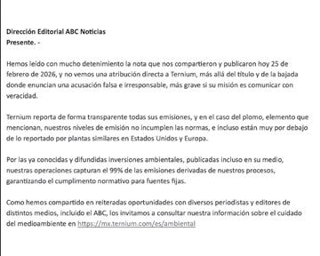 • La reportera de ABC Noticias buscó a la empresa acerera para conocer las acciones que realizan para mitigar la contaminación en la zona. Sin embargo, la compañía se limitó a enviar una carta asegurando que cumplen con las normas ambientales. Entre los cuestionamientos también se buscaba conocer sus protocolos ante la situación y cómo responden a alumnos que presentan afectaciones, pero no se obtuvo respuesta al respecto.