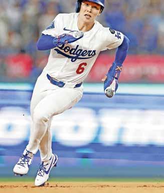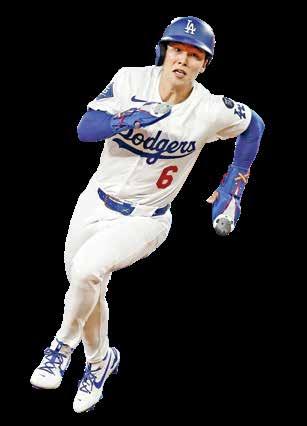 Jugadores de Dodgers celebran al momento en que Hyeseong Kim (foto arriba) anotó la carrera del triunfo.