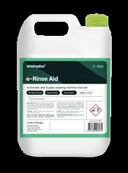 e-Rinse Aid is a professionally formulated auto rinse aid concentrate designed with a more environmentally responsible pro le. It is designed to ensure quick water drainage, elimination of water spo ing and streak free results on crockery, cutlery, and glassware in the automatic dishwashing process.