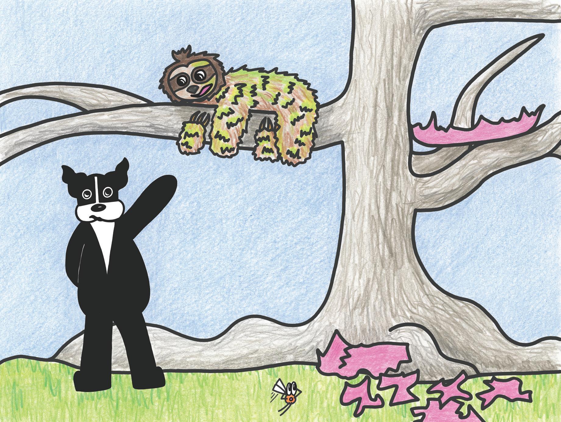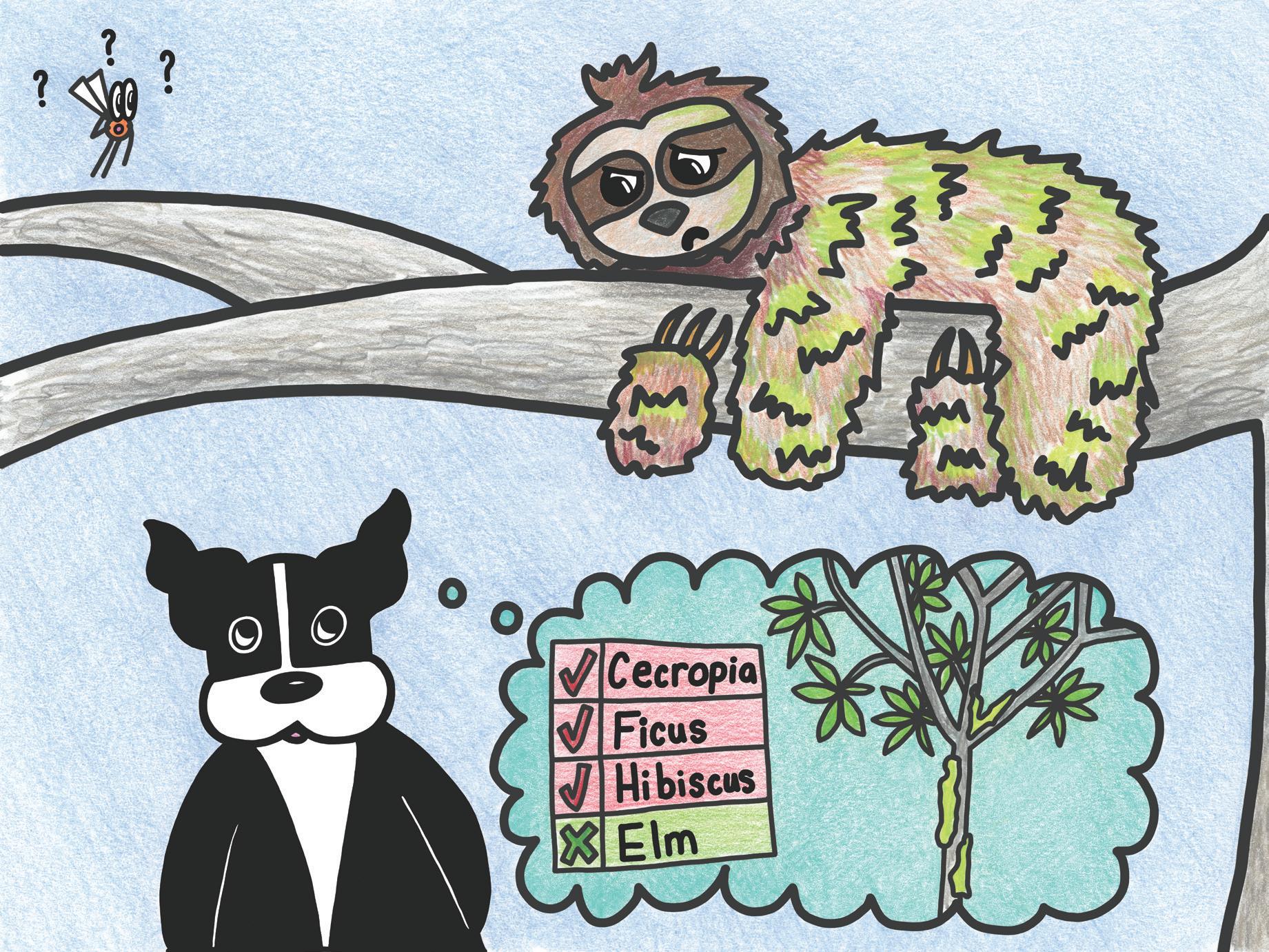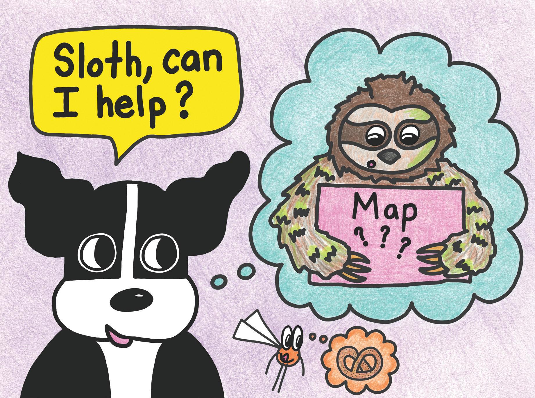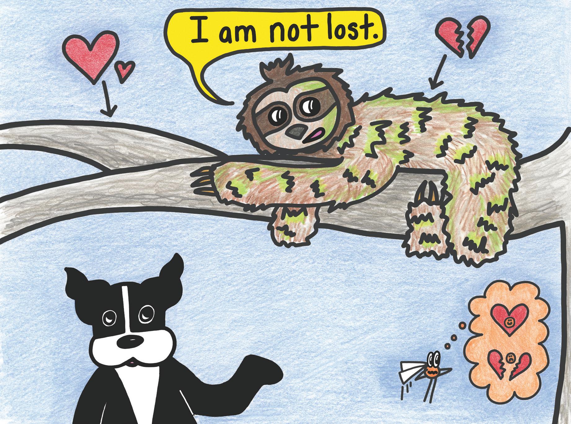 Dog yells up, “Sloth, can I help? A sloth comes from the tropics, but this is not a tropical land.”