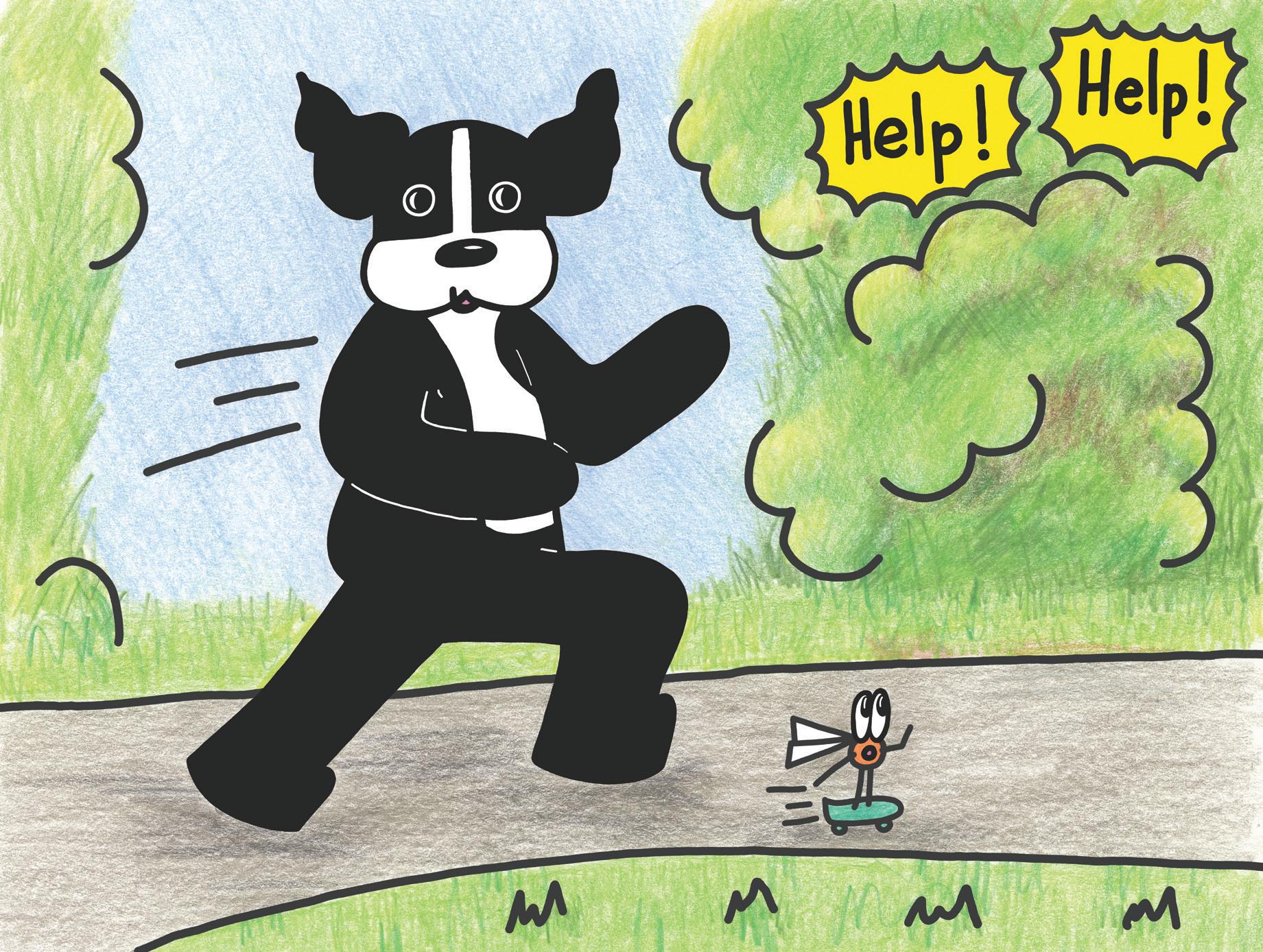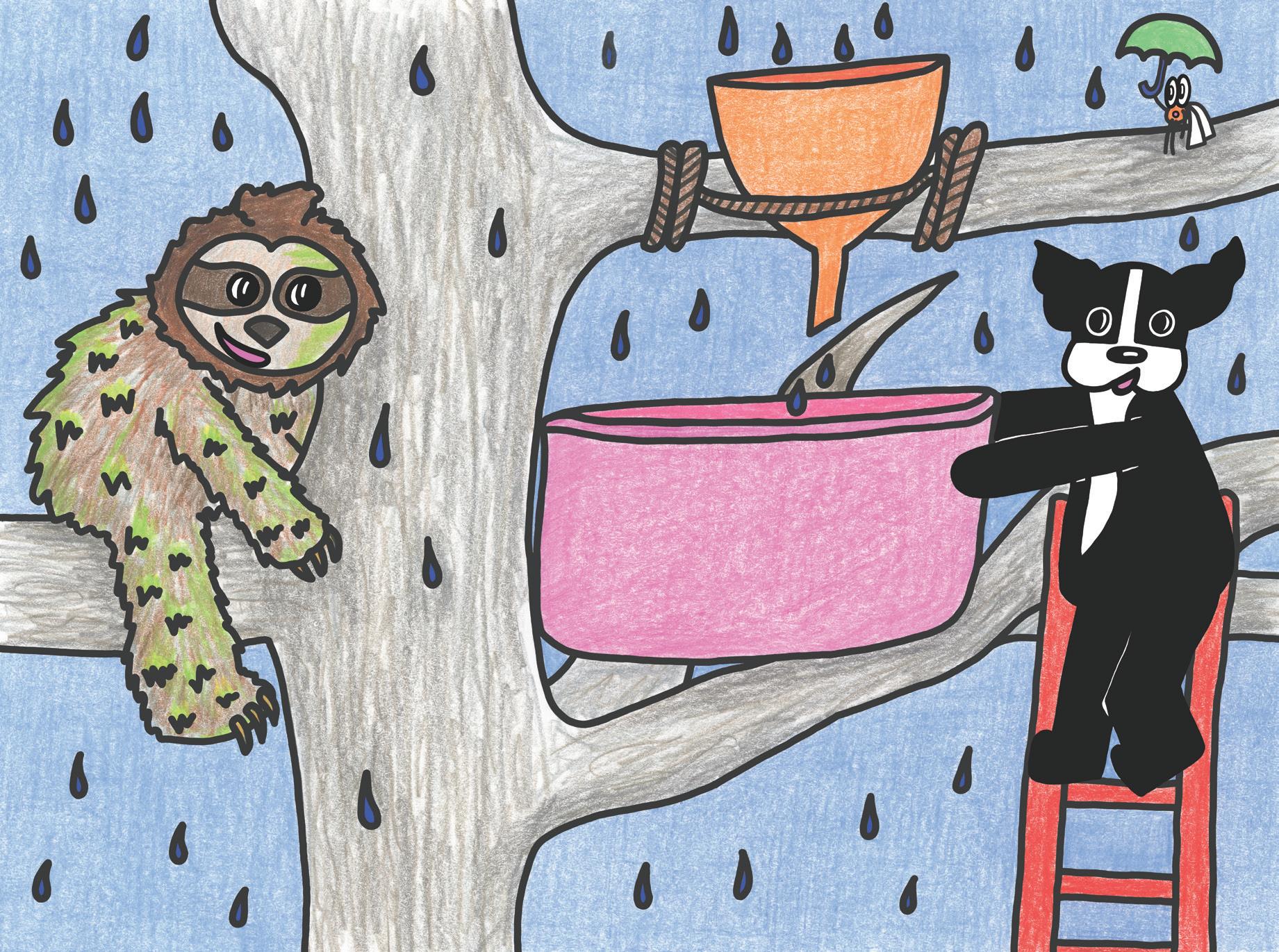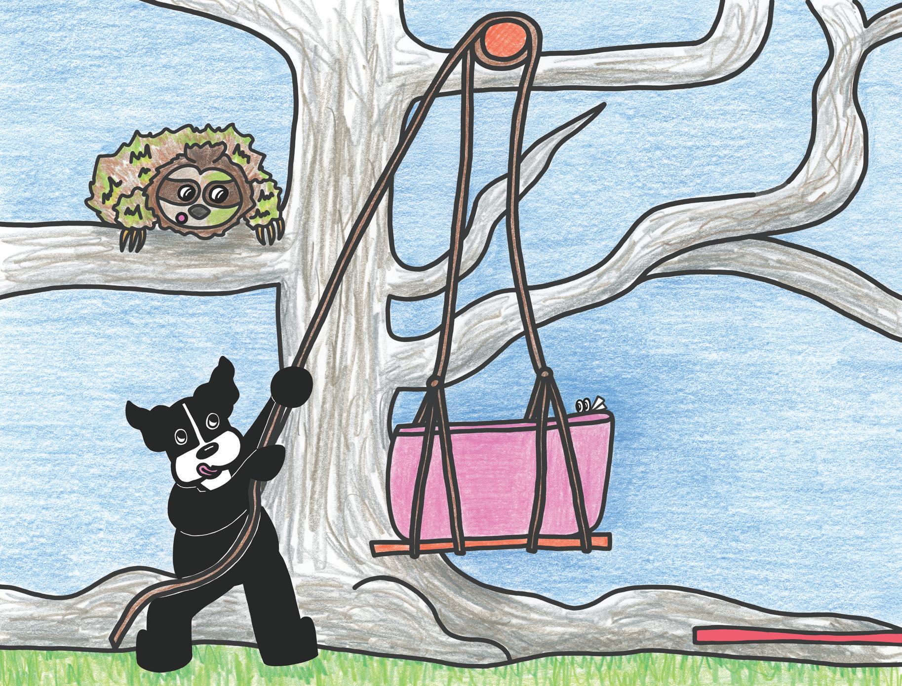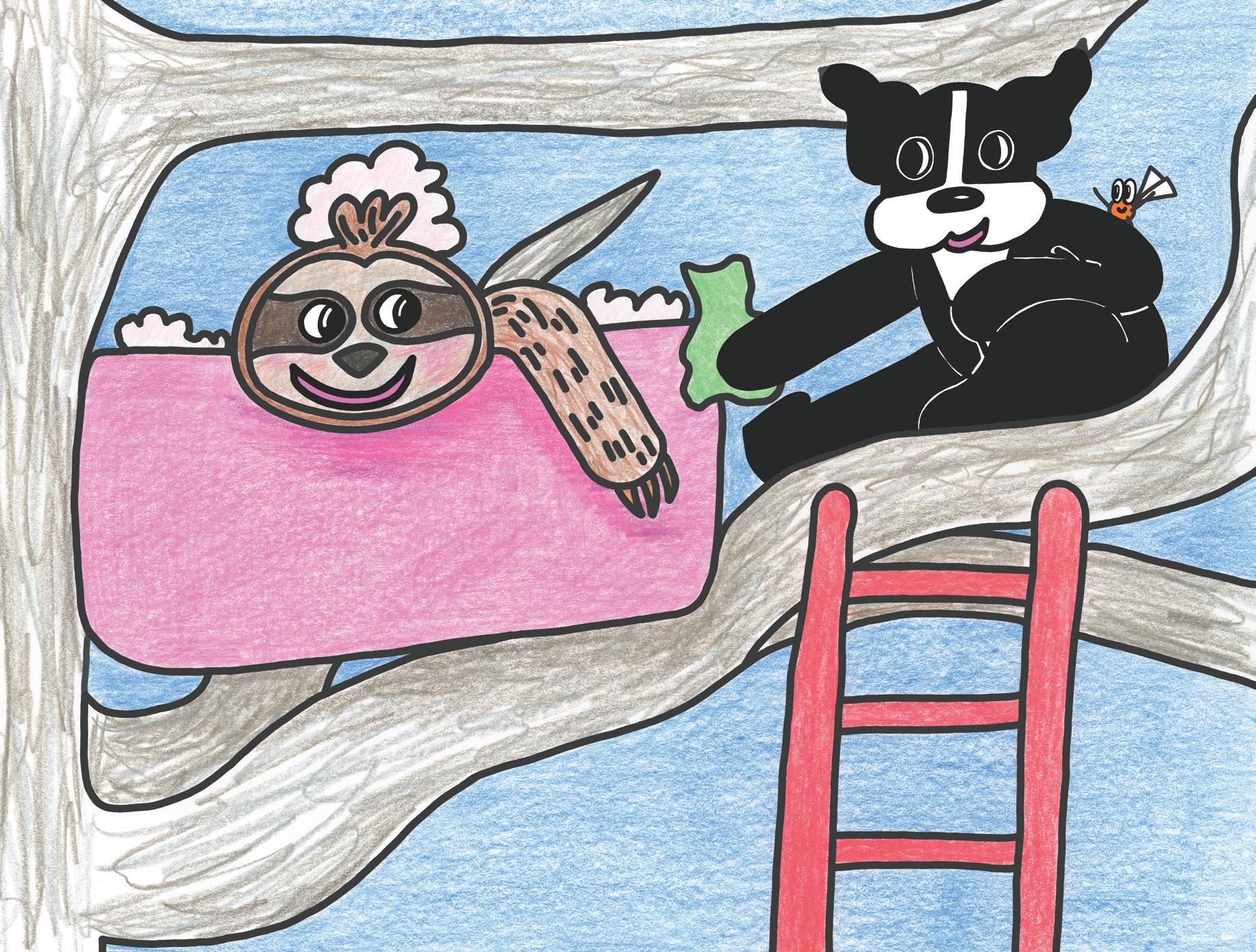 Dog yells up, “Sloth, can I help? A sloth comes from the tropics, but this is not a tropical land.”