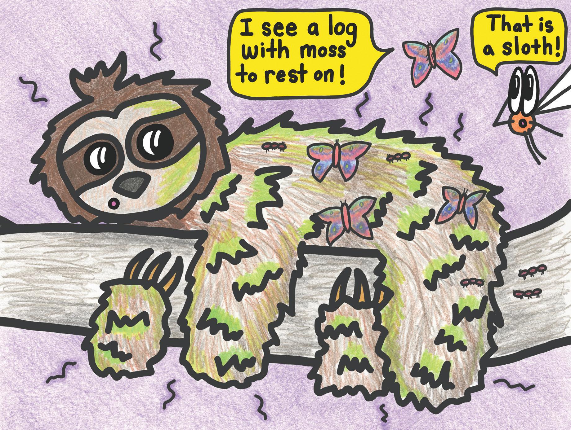 The moss has a smell that does not thrill the sloth. The insects and the moths see the sloth as a log.