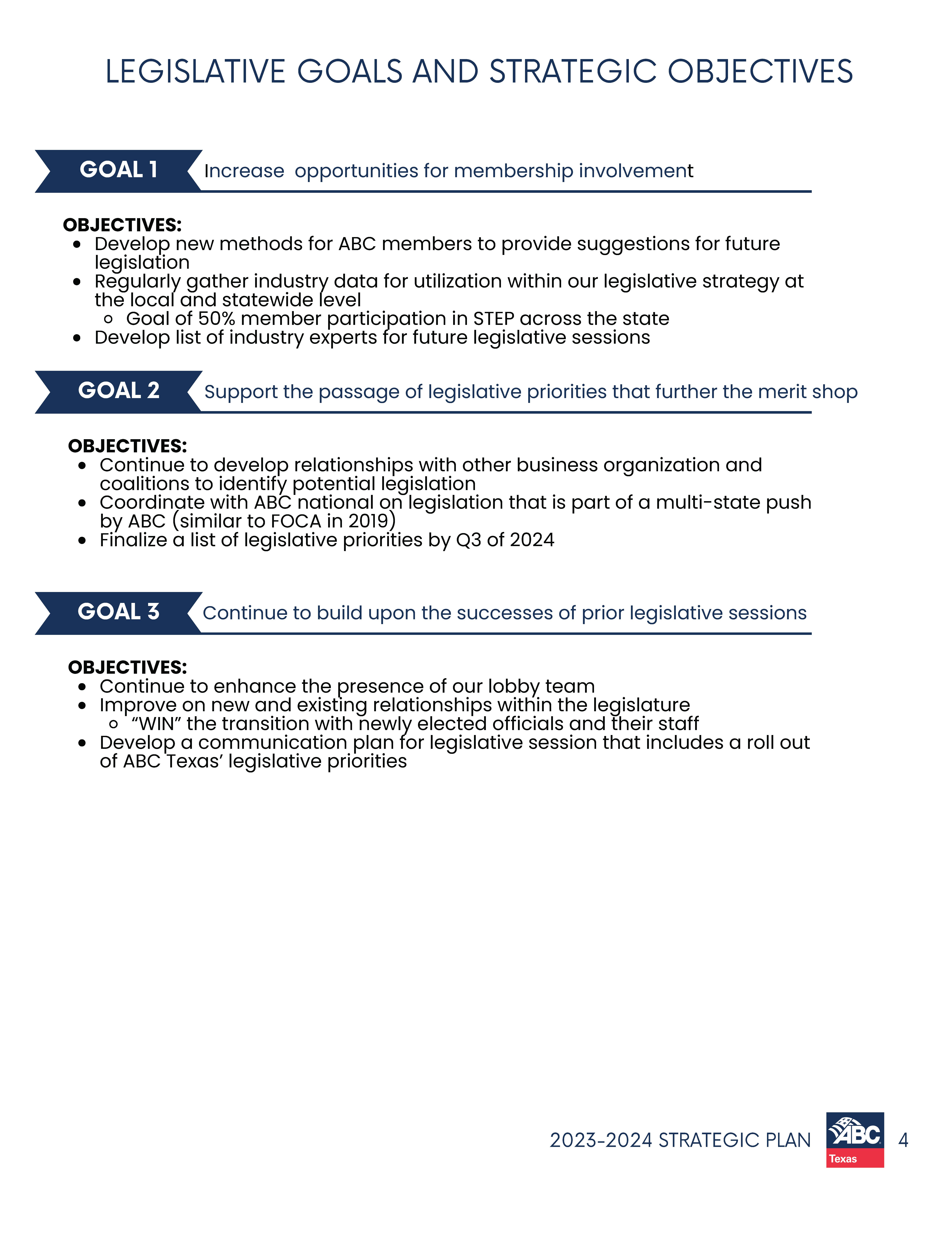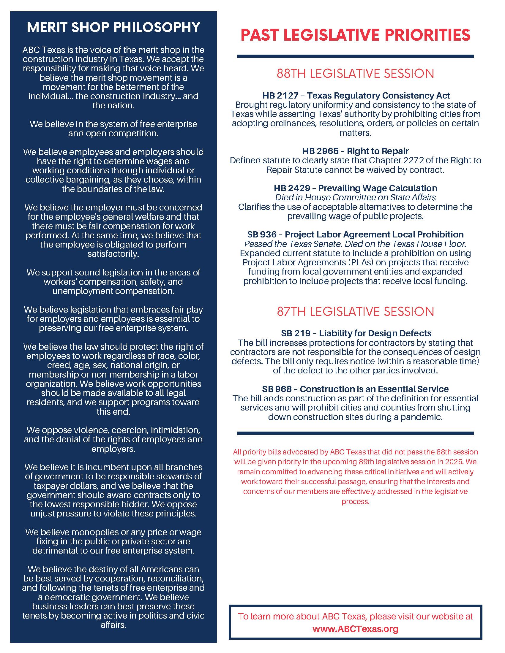 ABC represents members and the merit shop philosophy at the local, state and national level through legislative meetings, hearings and educational forums to protect and promote the principles of free enterprise.