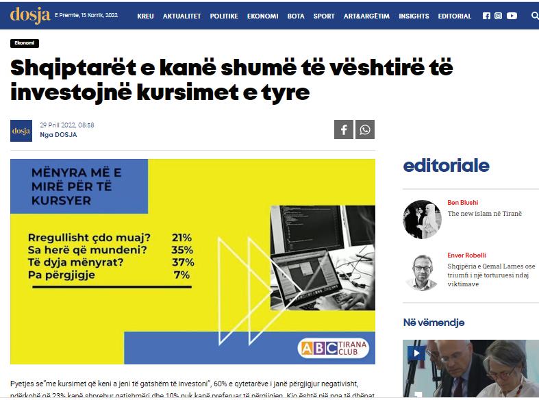 Ky është botimi mbi projektin "Kursim apo investim - Kur është koha!?”, si stacioni i katërt i programit studentor “Edukimi ekonomik dhe financiar i publikut”, organizuar ABC Tirana Club në periudhën mars - korrik 2022. Projekti u mbështet nga Raiffeisen INVEST dhe në bashkëpunim me Fakultetin e Ekonomisë në Universitetin e Tiranës. Qëllimet kryesore ishin: