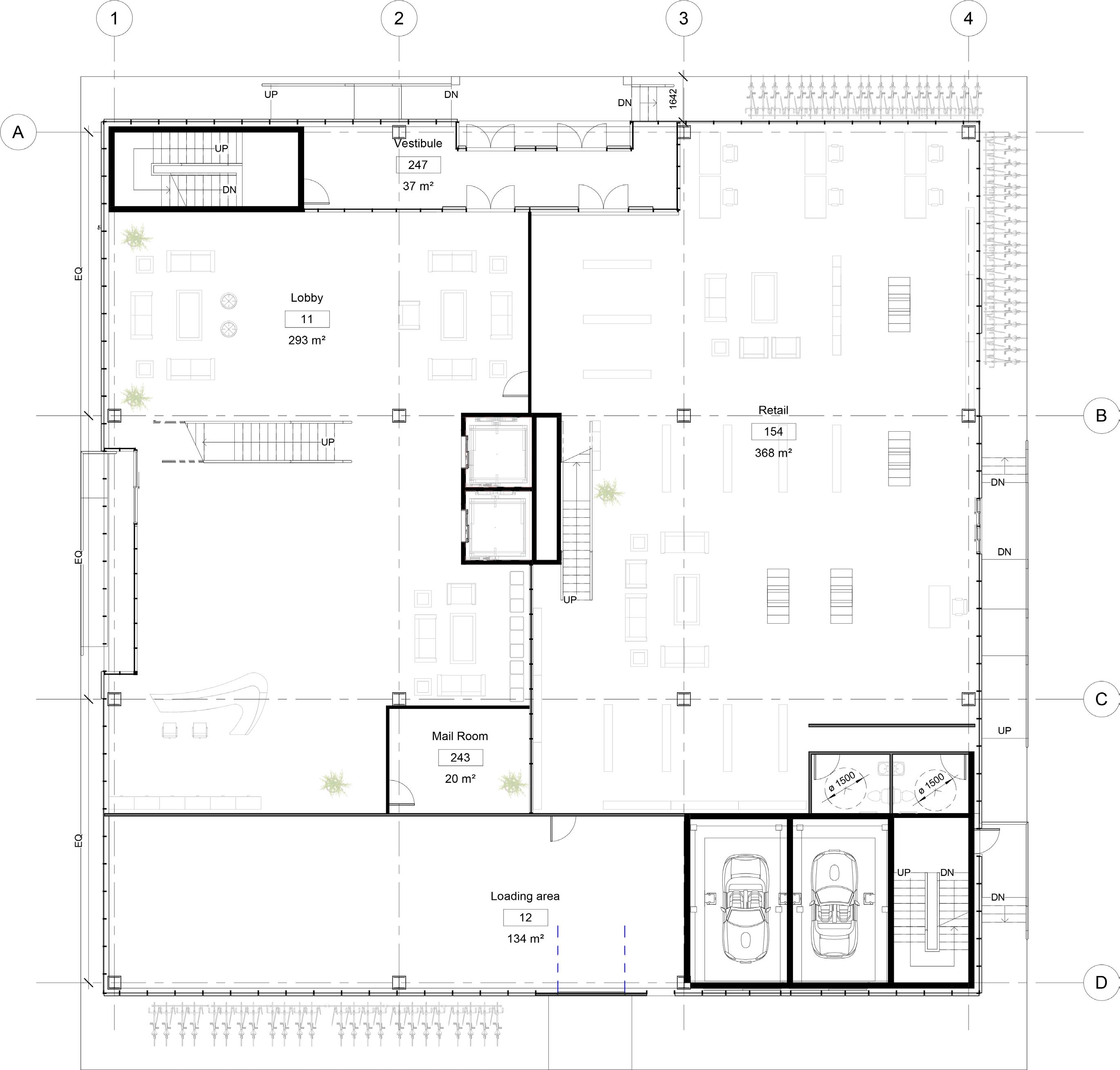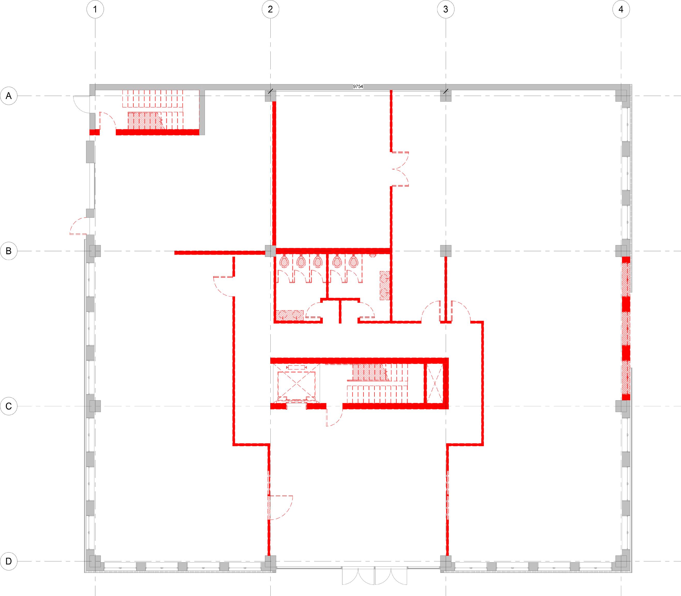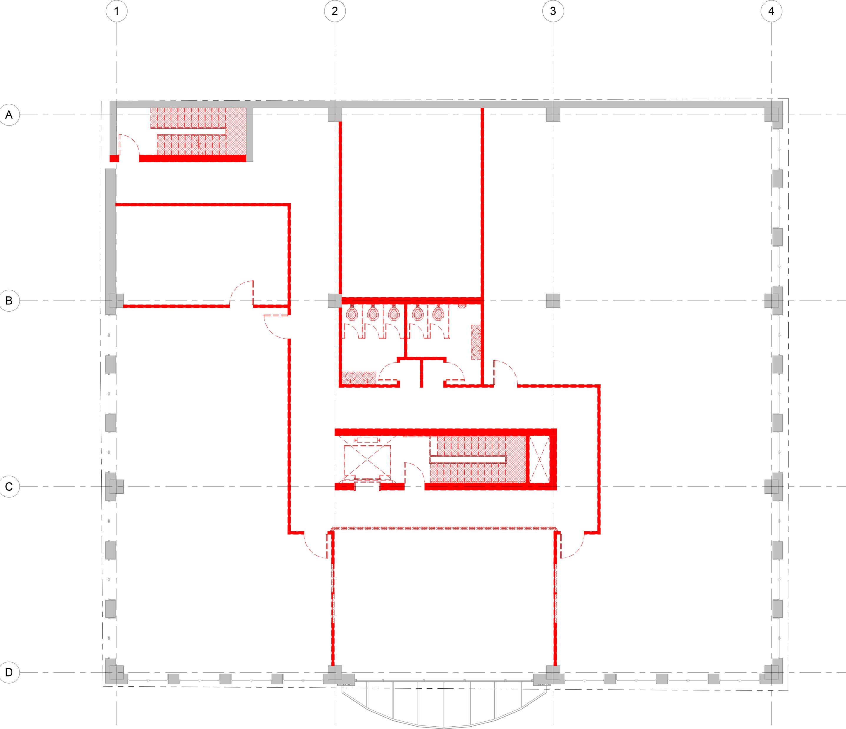 An additional elevator was included, required an expansion of the core shaft, and allowance for all necessary vertical elements, such as stairs and mechan ical shaft.