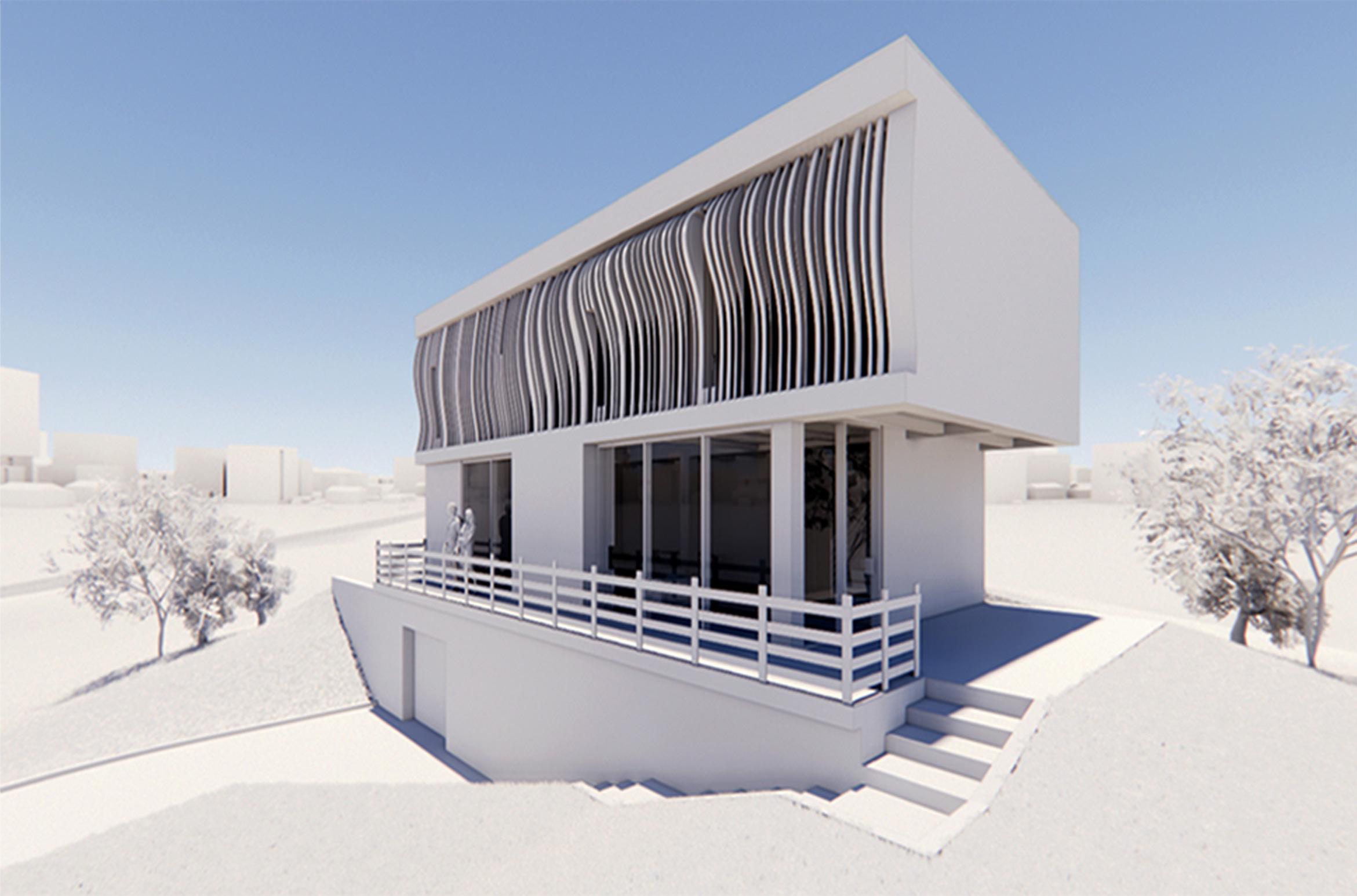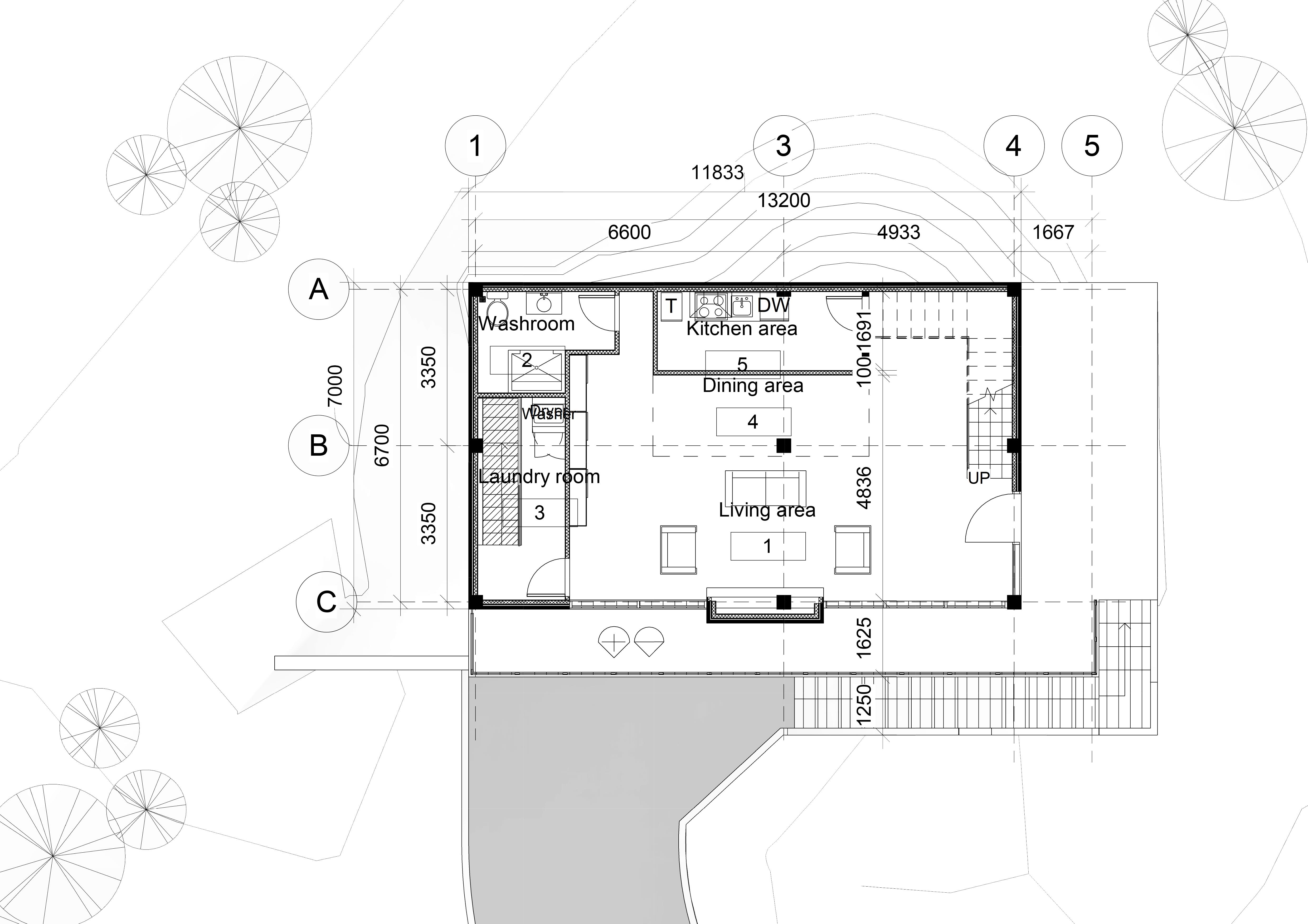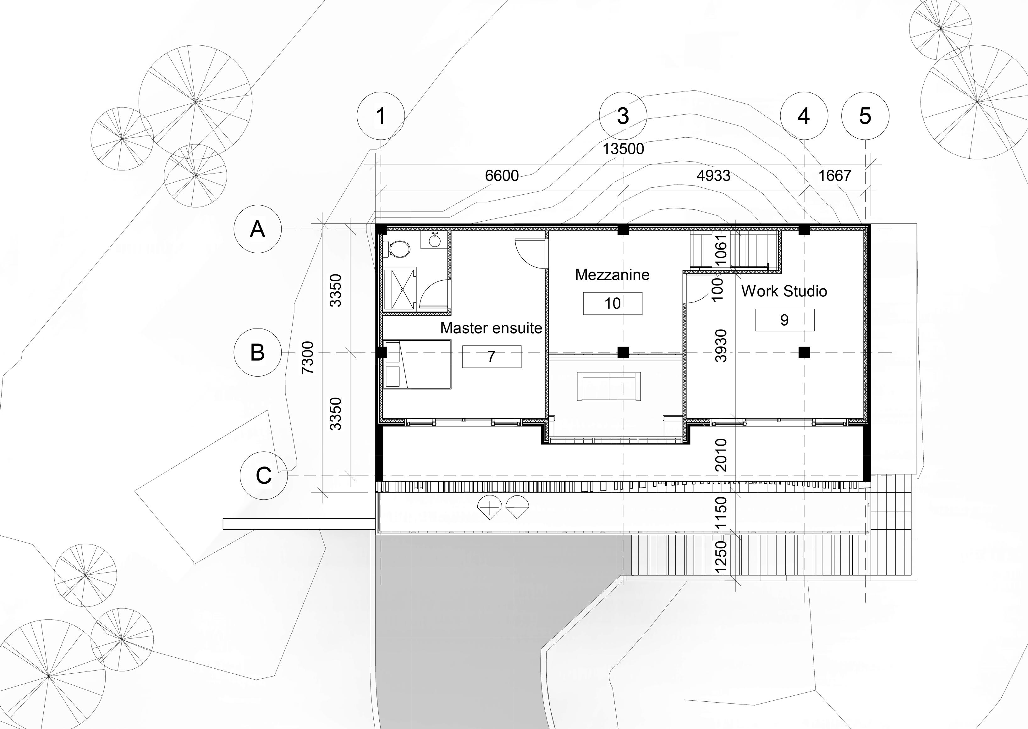 A small live/work house for a creative client. A two storey building with a 100 sqm building area, located in a hilly site. The spatial program is as follows: An entrance, living space, sleeping space, washroom, kitchen/dining area, storage space, landscaped area, work studio.