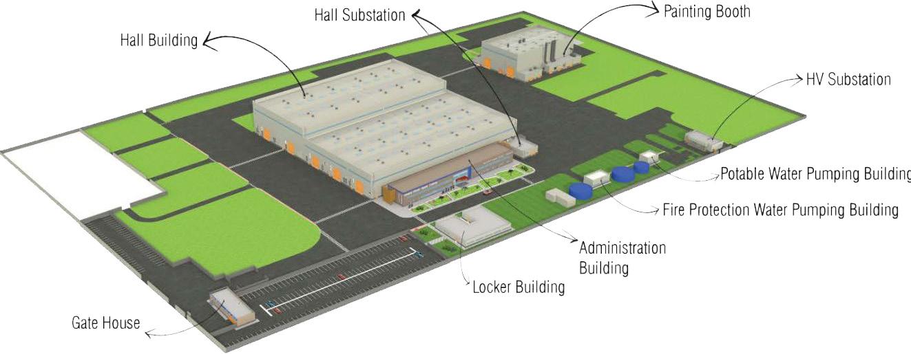 The factory is constitued by buildings hav ing a total surface of 30000sqm, divided into: facility production buildings, auxilliary buildings, main administration and electri cal substations.
