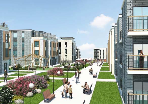 The Village at Bay Creek is a 322-unit mixed-income, mixed-typology community inspired by themes of nature, health, and healing. Built in three phases, the community will be financed with a mix of Low Income Housing Tax Credits ax (LIHTC), home sale proceeds, private debt and other grant sources. To provide financially accessible homeownership, o The Village will add 72 townhomes for purchase that are competitively priced for 120% AMI first-time homebuyers. The remaining 250 units are rentals with 91% of the units set as permanently affordable, priced for between 30% and 60% AMI rent limits. All rental units will be net zero through a mix of solar and geothermal systems. The community features generous, integrated open space and a new community center for the Bay Creek neighborhood, funded through coordination with the City of Madison’s forthcoming comprehensive plan update which will include guidelines for future community center siting and funding.1 Outdoor and indoor community space was programmed with themes of gardening and health, reflecting both community feedback and the history of the Monona Bay area as a